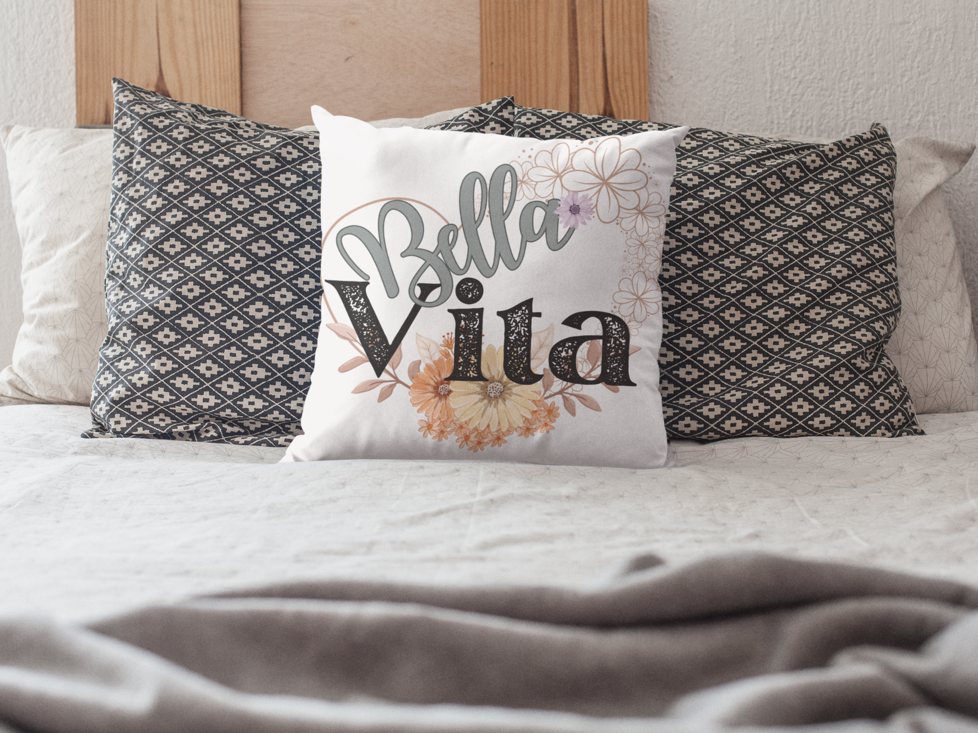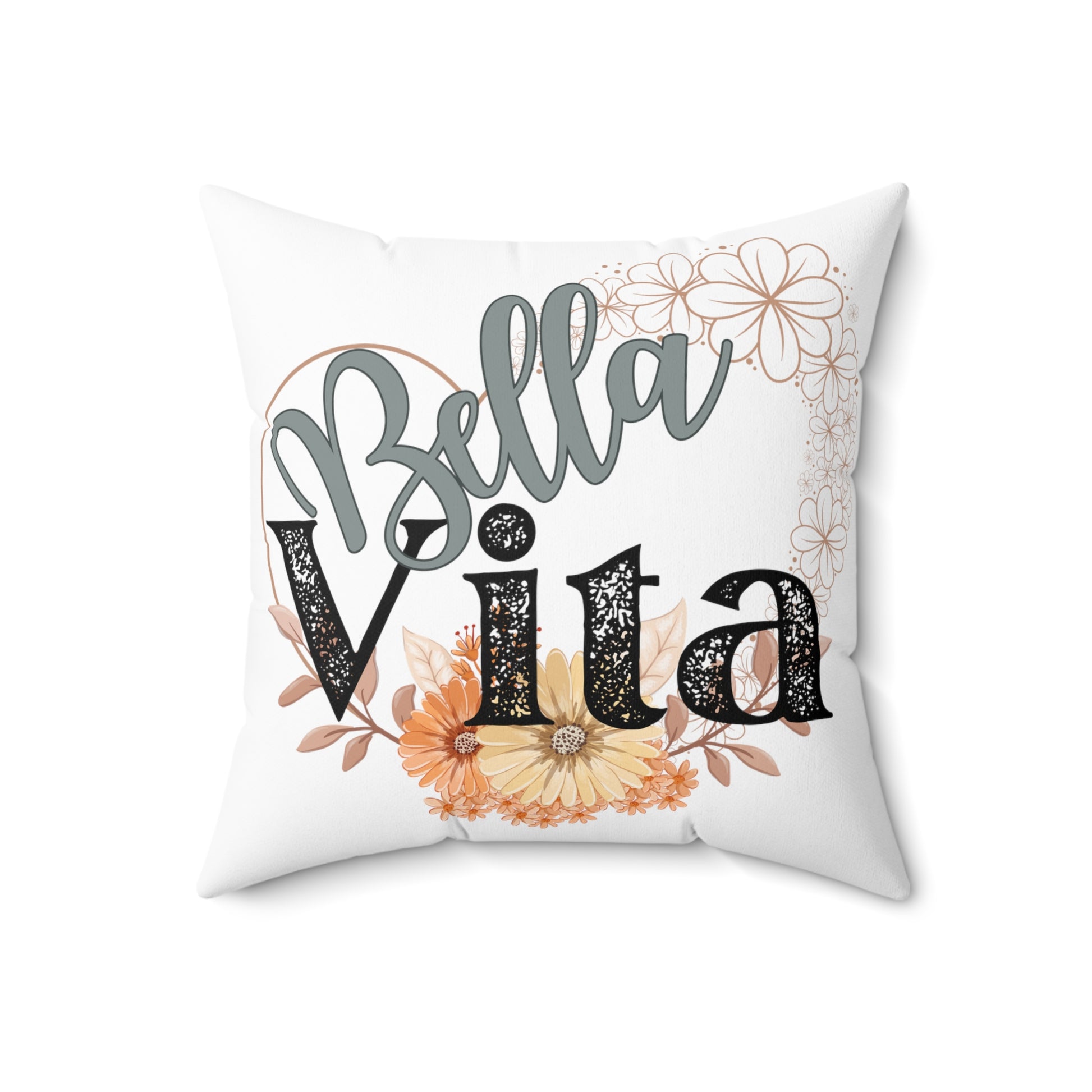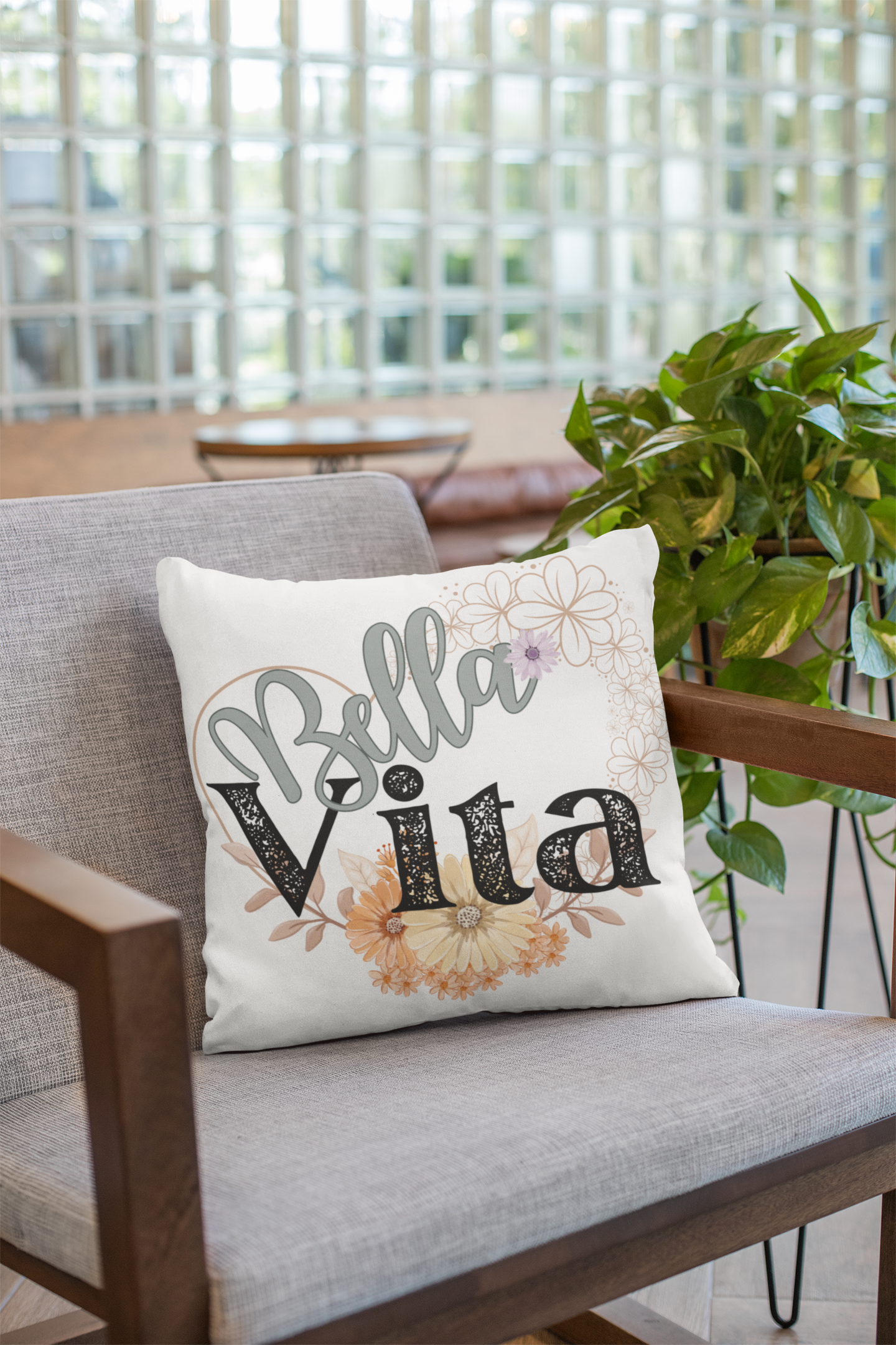 "Beautiful Life" in Italian will make any room inviting and warm especially with this charming accent pillow featuring the words "Bella Vita" framed by a soft heart and flowers. This bright white pillow will add a feeling of light to your living room, bedroom, or area of choice.