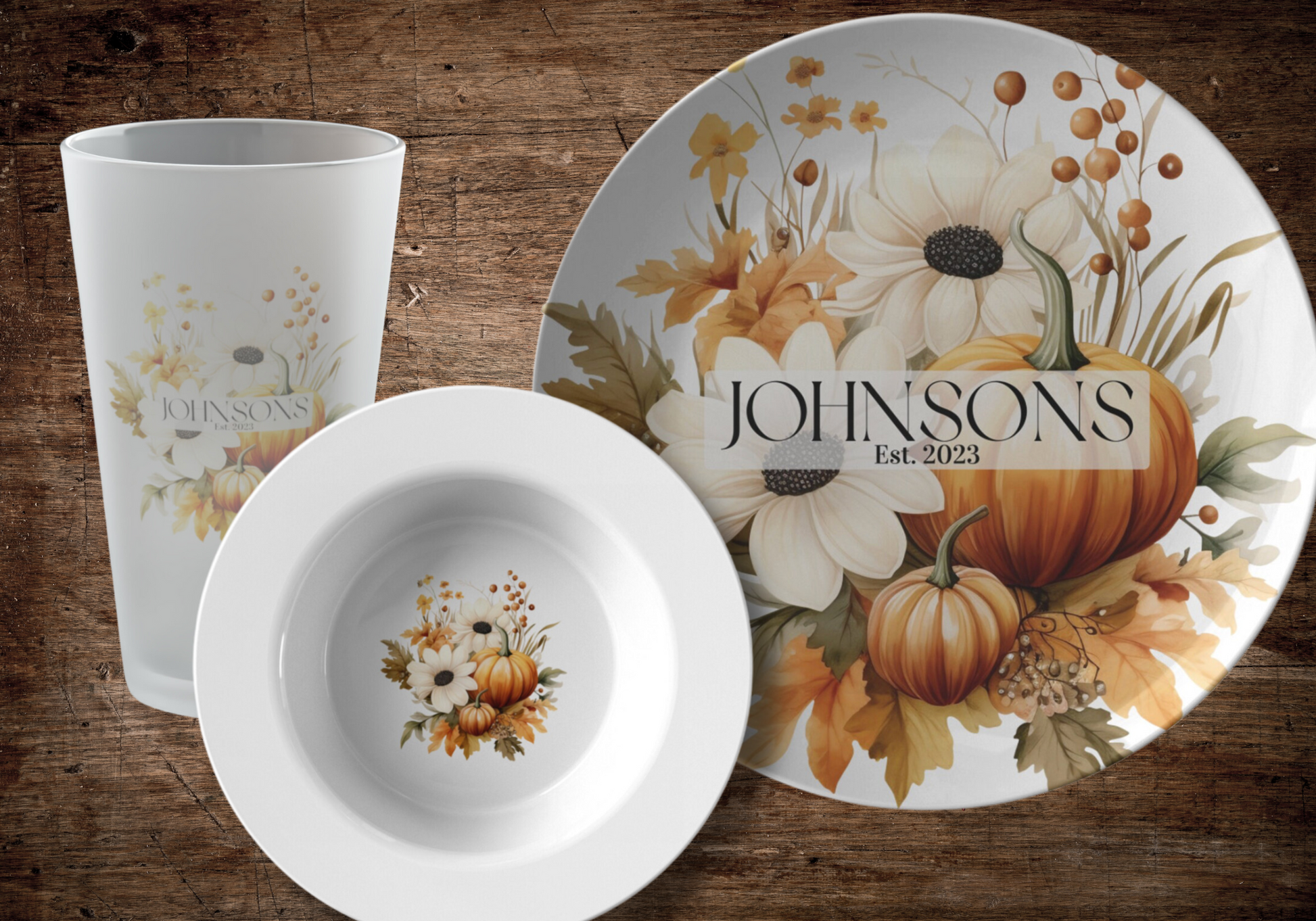 Hosting a fall event or needing the perfect customized wedding gift for a couple? This beautifully crafted personalized dinner plate is just what you need to stand out in the crowd. Available in a 10” plate with a matching 8.5” bowl and 16oz. frosted glass (sold separately). Purchase individually or mix and match a complete set. The “PUMPKIN PATCH COLLECTION” features 6 different styles with coordinating colors and theme to allow you to build your own set.