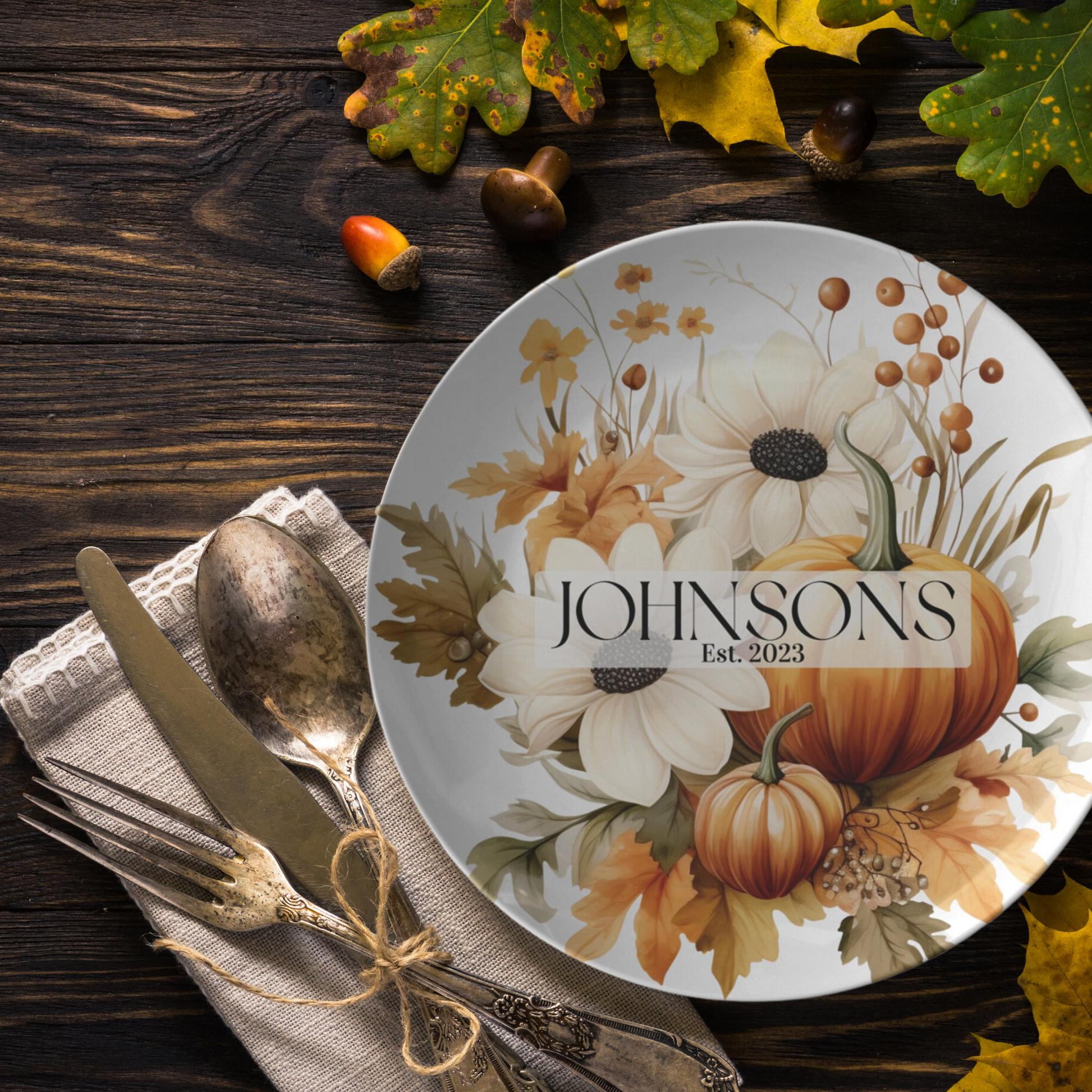 Style 3 Features bright pumpkins with cream daisies as a focal point, surrounded by fall foliage. Centered in the design is a light transparent text box to fill with your custom last name of choice along with the featured “Established” year showcasing a couple’s first holiday season together.