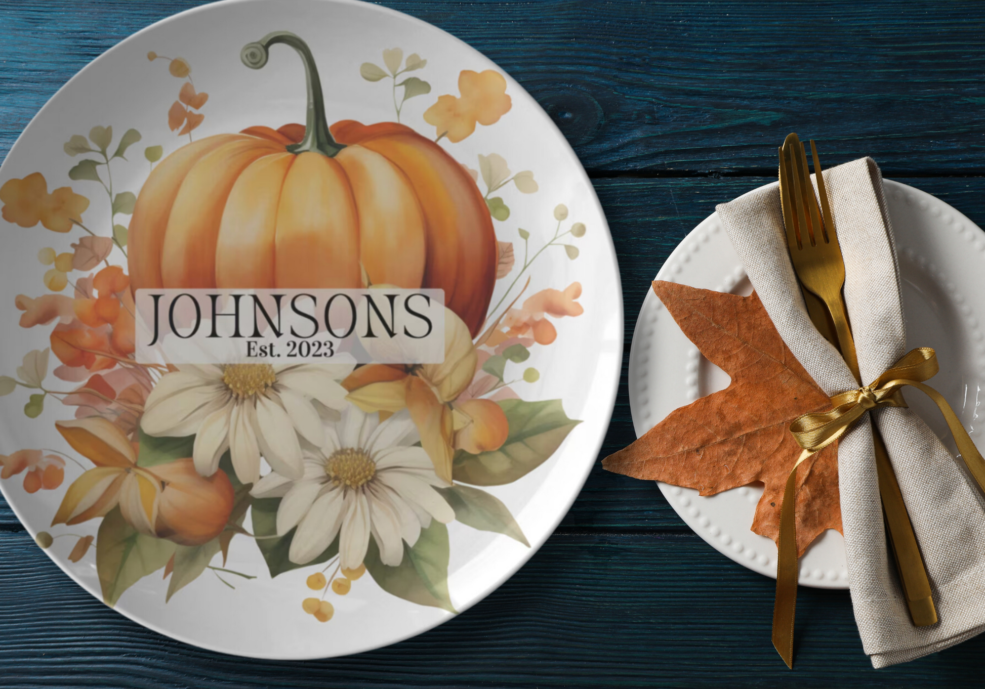 Hosting a fall event or needing the perfect customized wedding gift for a couple? This beautifully crafted personalized dinner plate is just what you need to stand out in the crowd. Available in a 10” plate with a matching 8.5” bowl and 16oz. frosted glass (sold separately). Purchase individually or mix and match a complete set. The “PUMPKIN PATCH COLLECTION” features 6 different styles with coordinating colors and theme to allow you to build your own set.