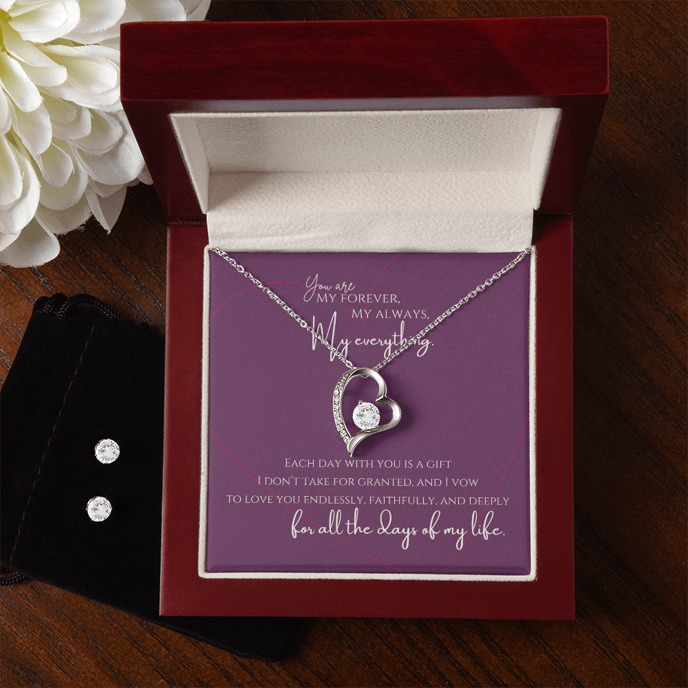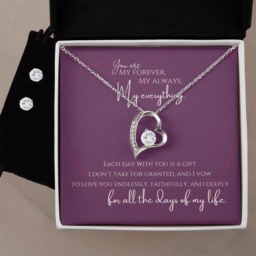 “Forever, Always, and Everything” Heart Necklace and Earring Set - White Gold