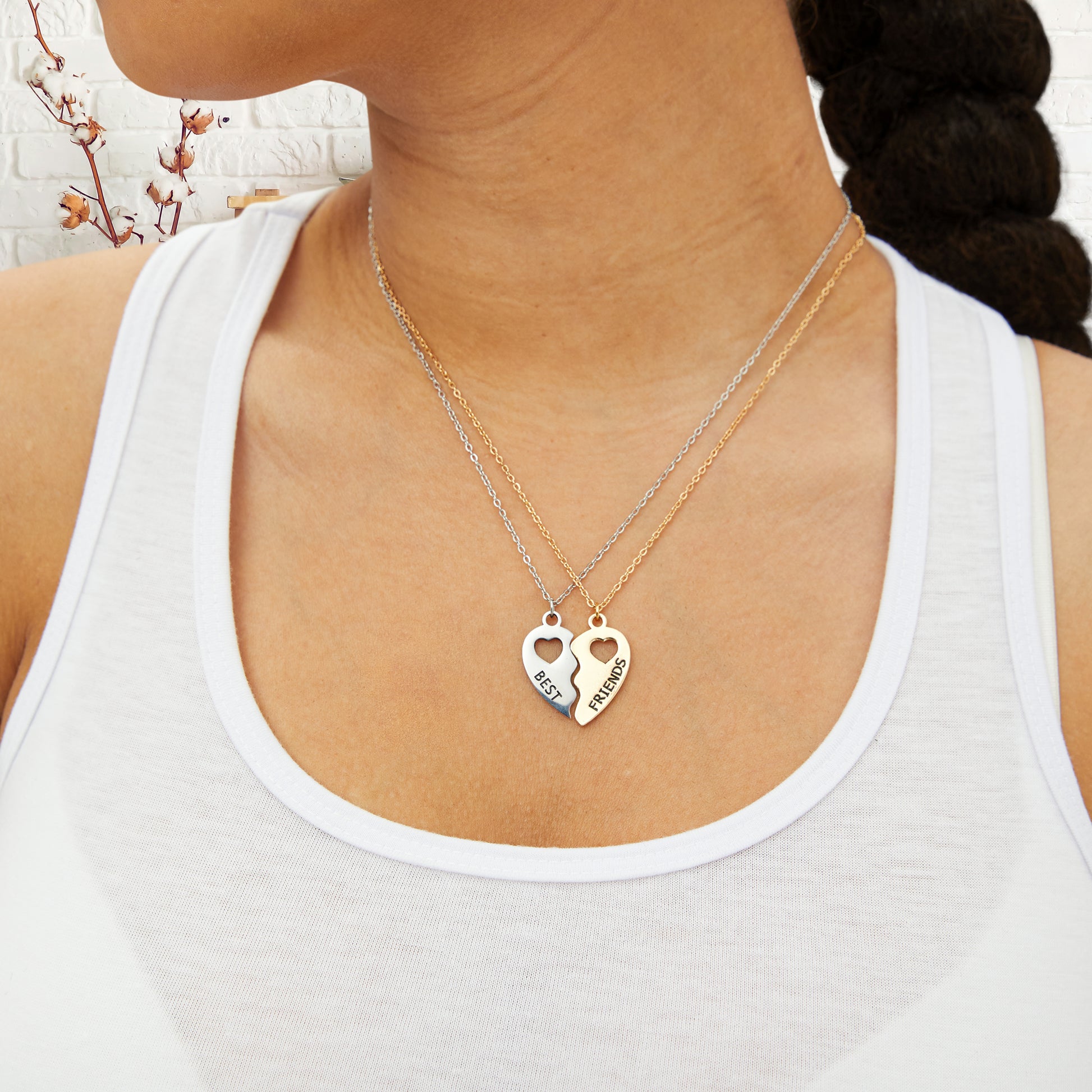 Made to rejoice in friendship, these stainless steel and 18K gold-plated pendants are as durable as a great friendship. The pendants are tarnish-resistant and feature a 17.7"-21.7" adjustable chain made of stainless steel with a lobster clasp attachment.