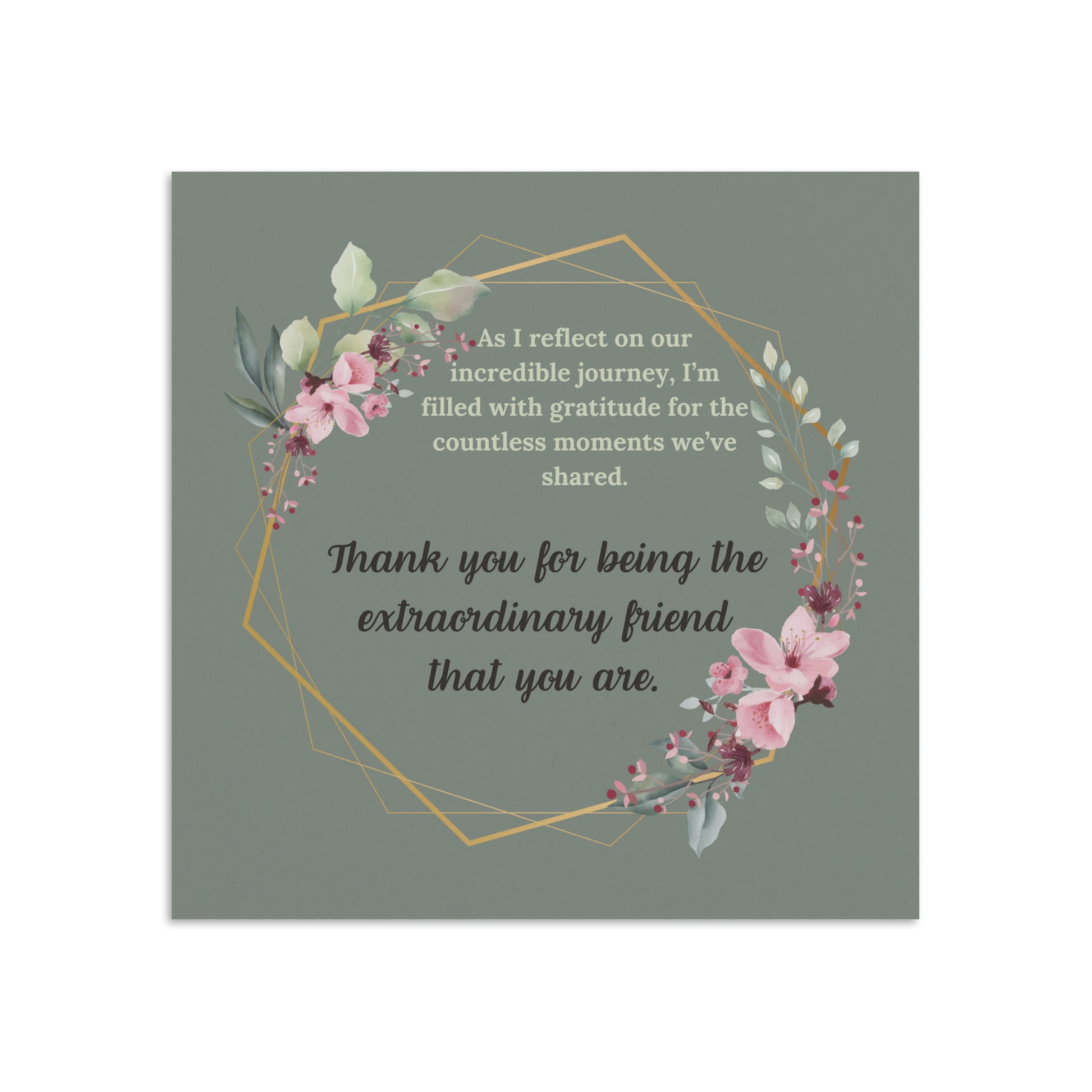 The perfect friendship gift for any birthday, holiday, or simply to say "Thank you". Inside the box, the sweet message reads "As I reflect on our incredible journey, I'm filled with gratitude for the countless moments we've shared. Thank you for being the extraordinary friend you are."