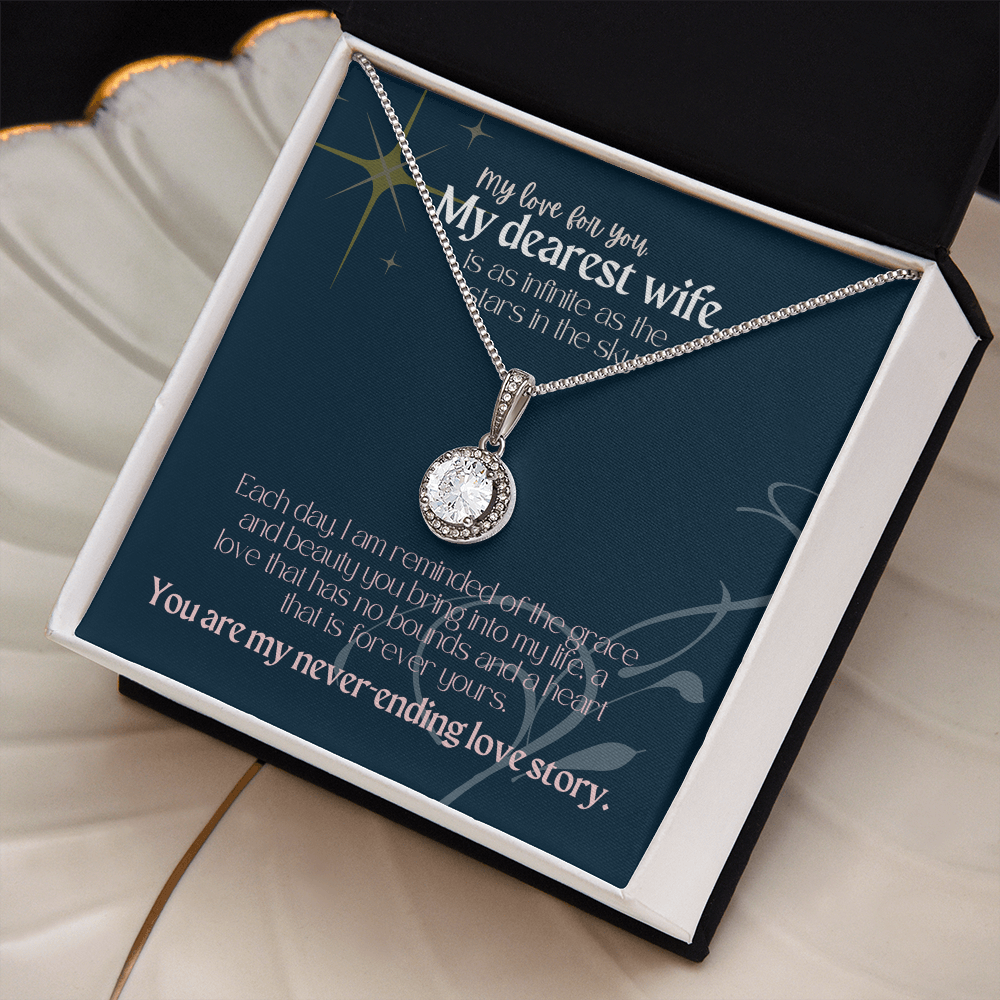 "My love for you, my dearest wife, is as infinite as the stars in the sky. Each day, I am reminded of the grace and beauty you bring into my life, a love that has no bounds and a heart that is forever yours. You are my never-ending love story."