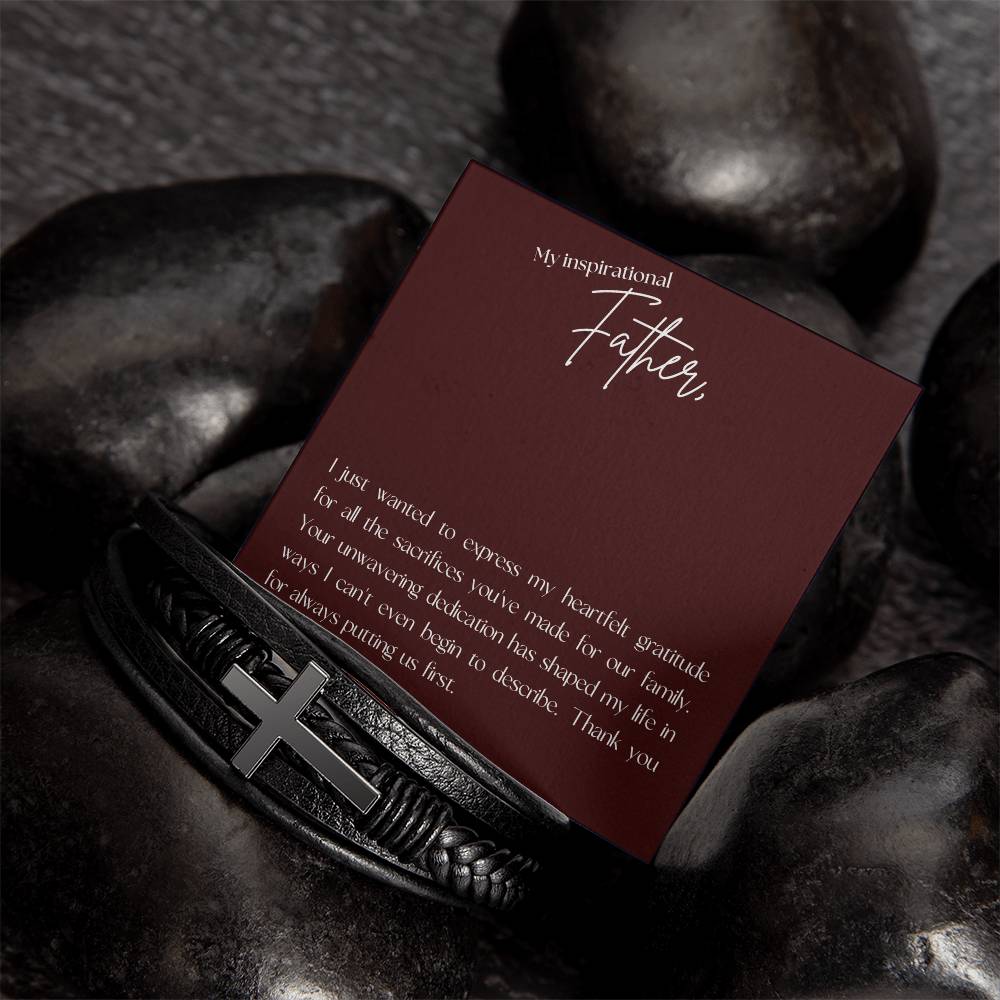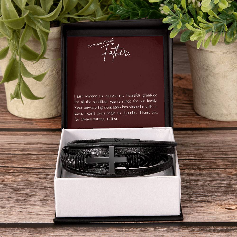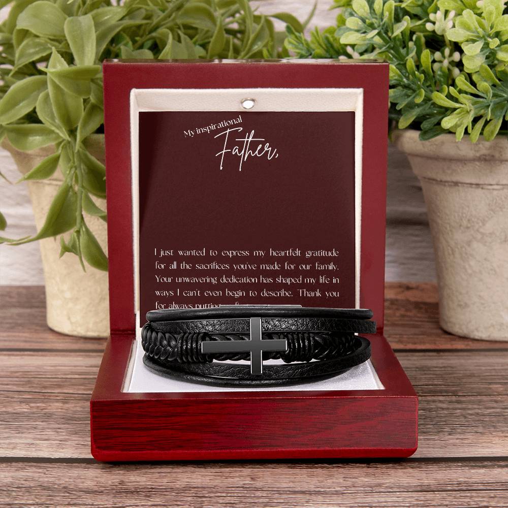 Looking for the perfect gift for gather figures in your life? Look no further than our “Inspirational Gratitude” Men’s Cross Bracelet. With a Stainless Steel Decorative Cross and strong Magnetic Clasp in black finish, it’s a gift for father figures that exudes elegance.