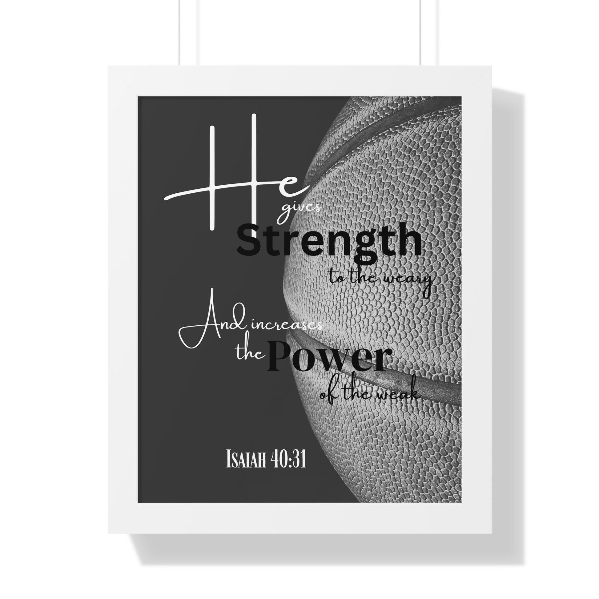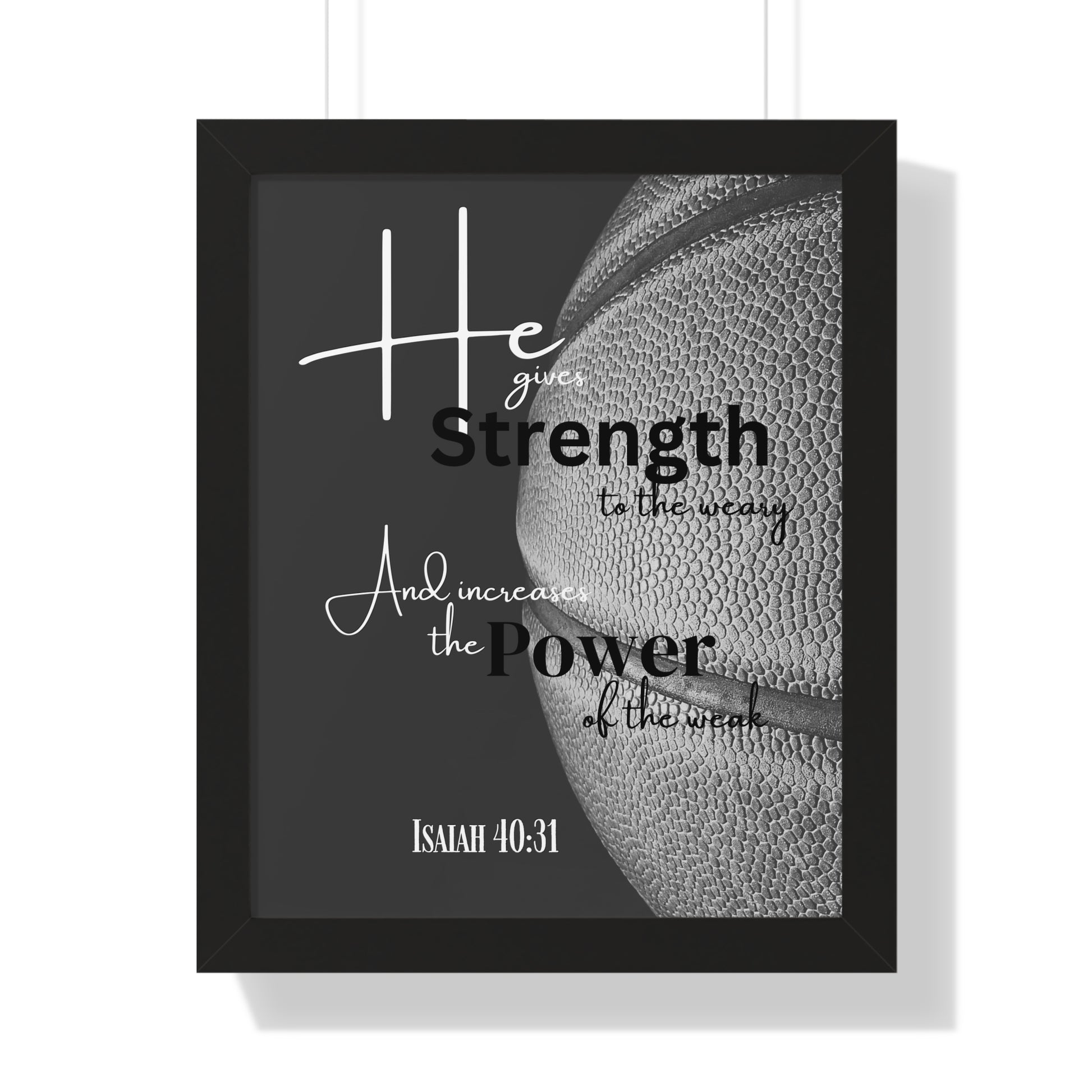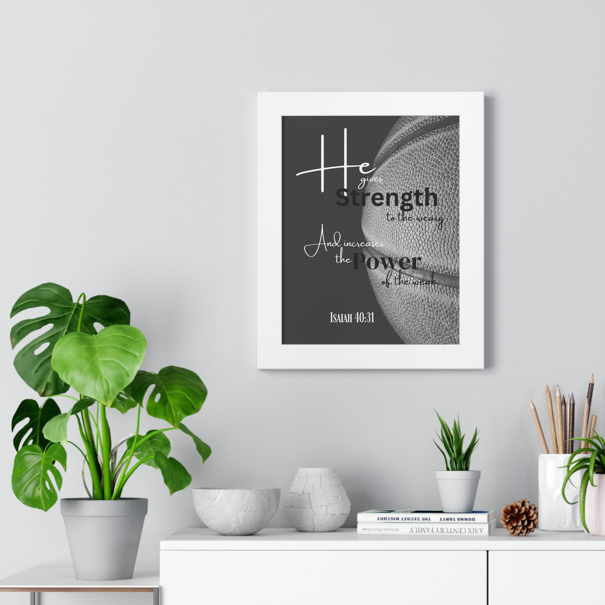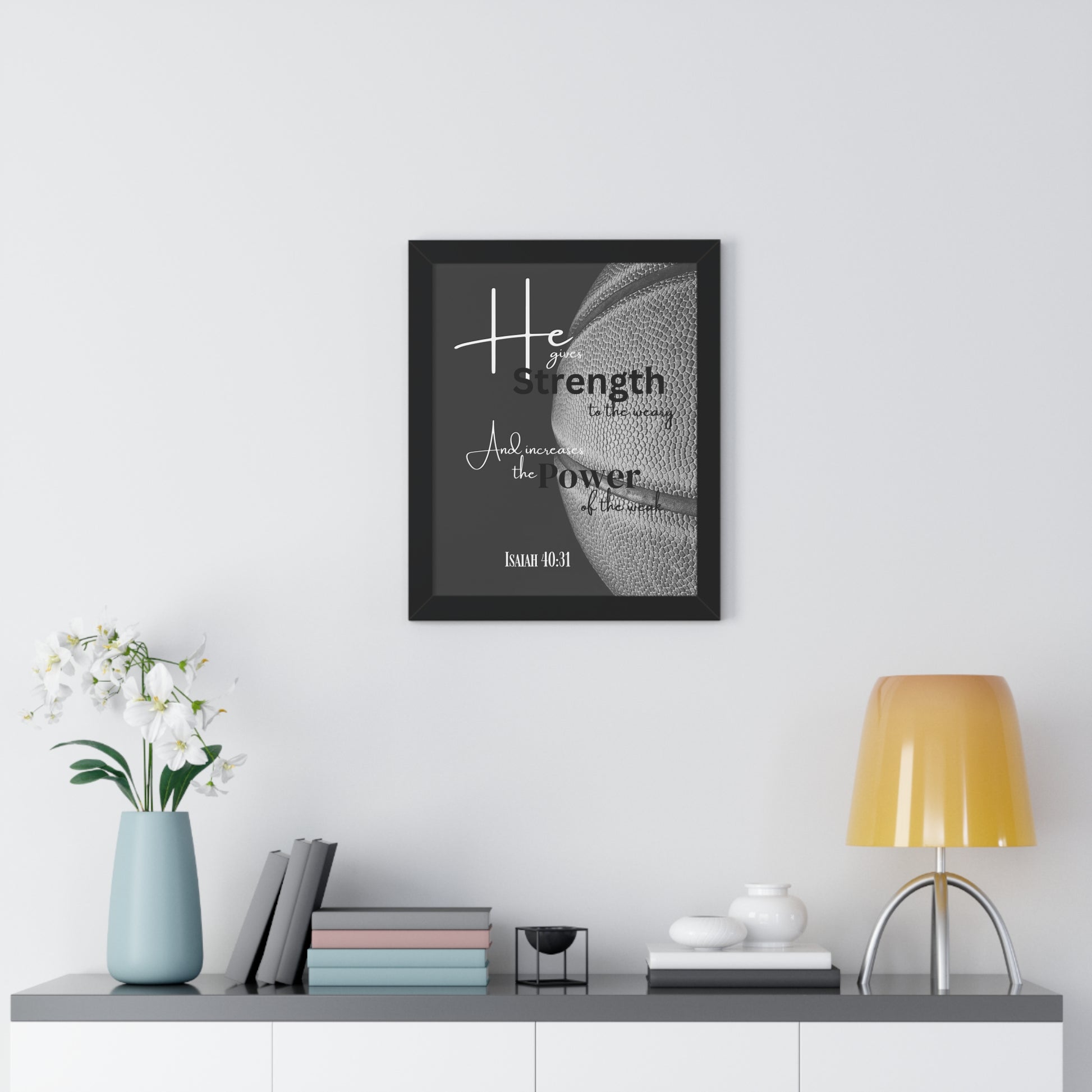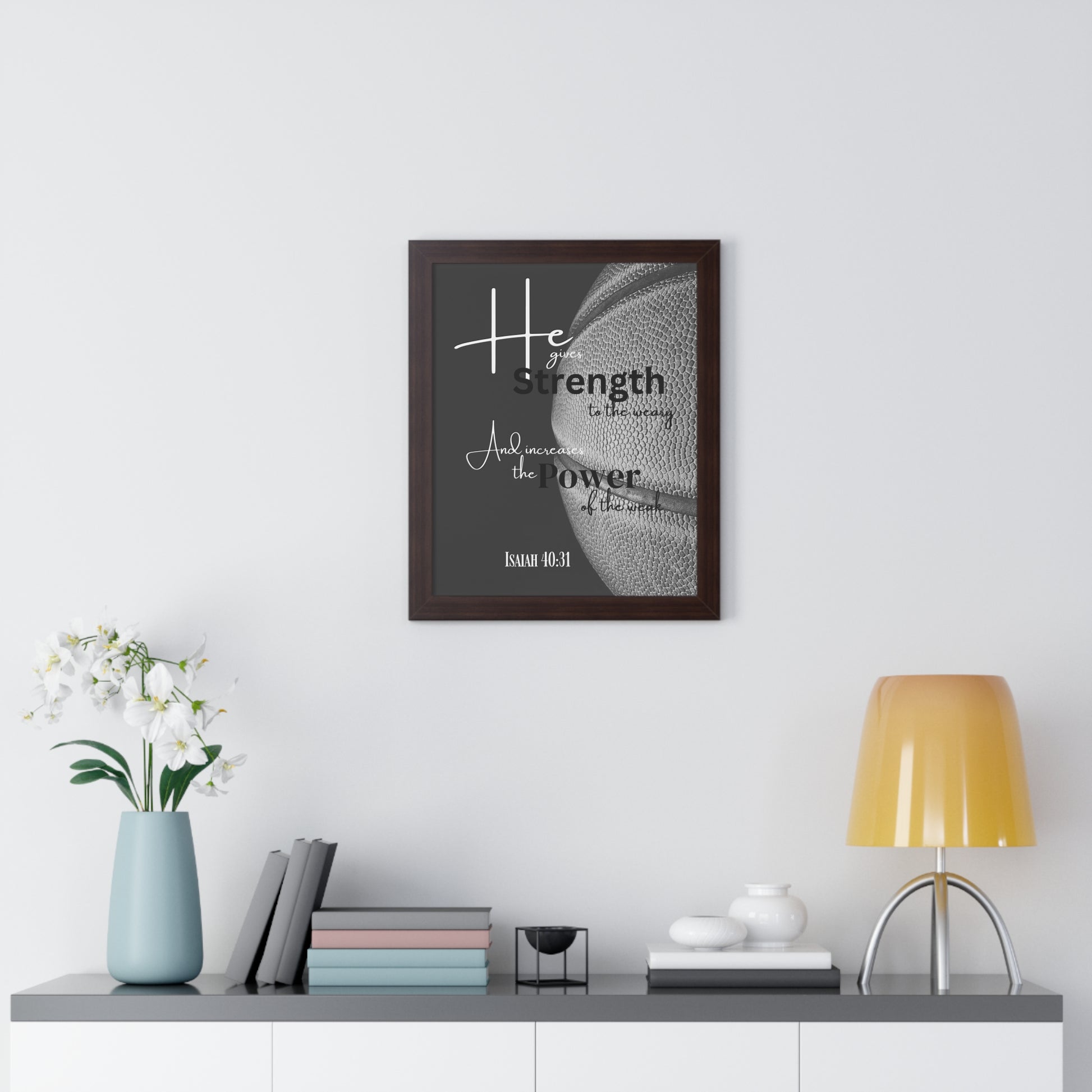 Elevate your space with this inspiring basketball poster featuring a render of the powerful Bible verse Isaiah 40:31. Let the words “He gives strength to the weary and increases the power of the weak” accompany your love of for the game. Perfect for any basketball enthusiast seeking motivation and faith in their surroundings.