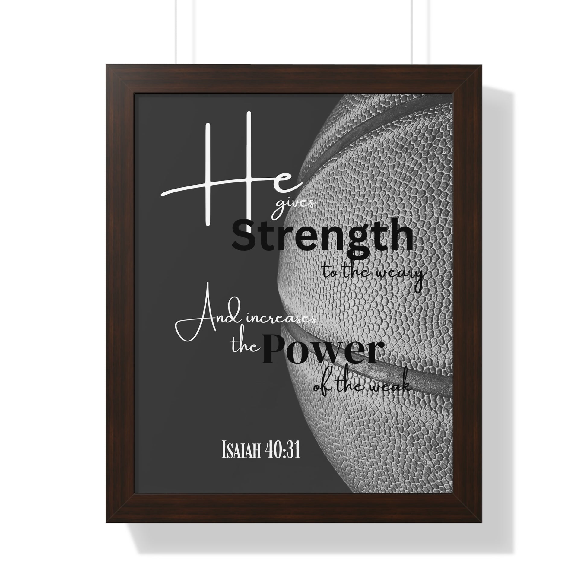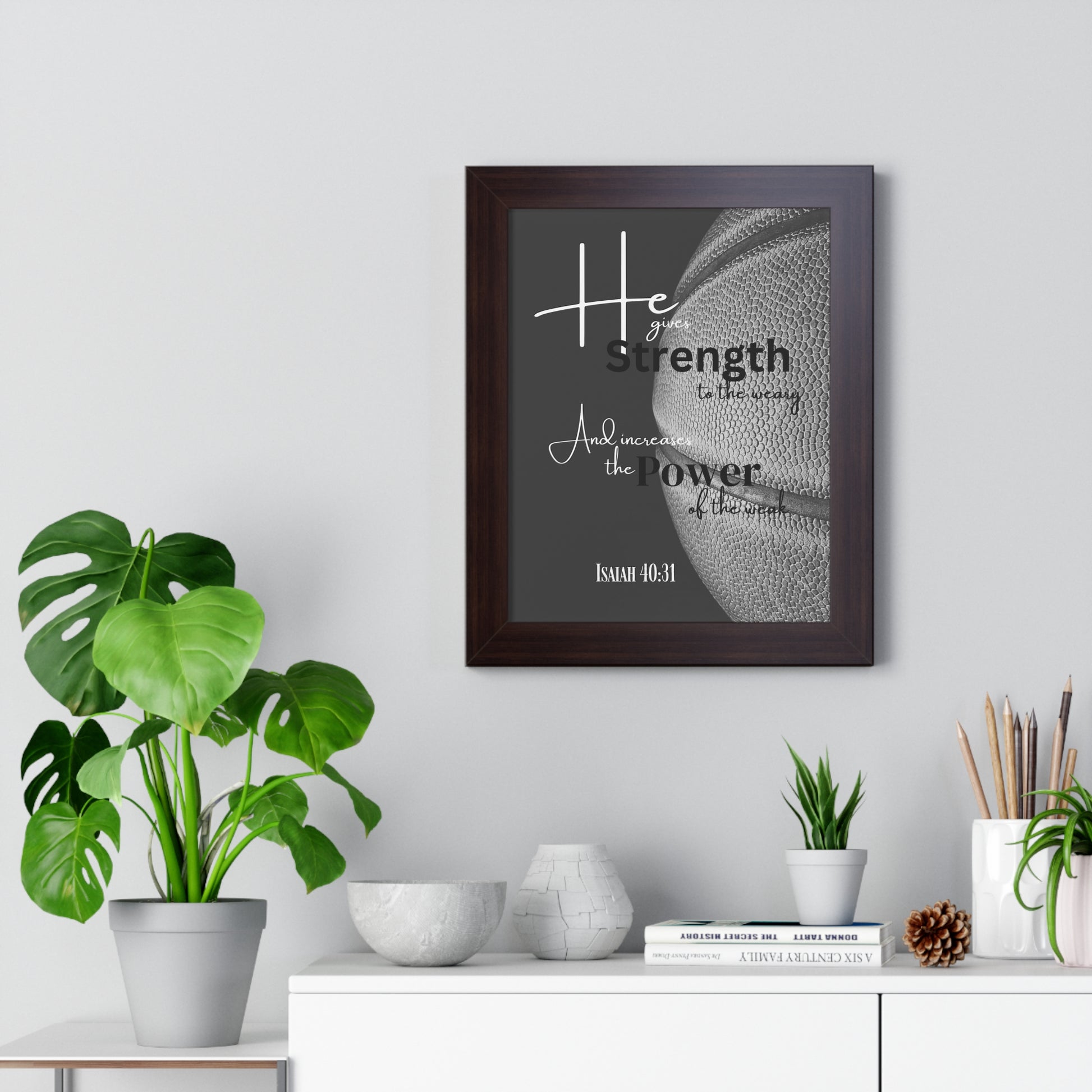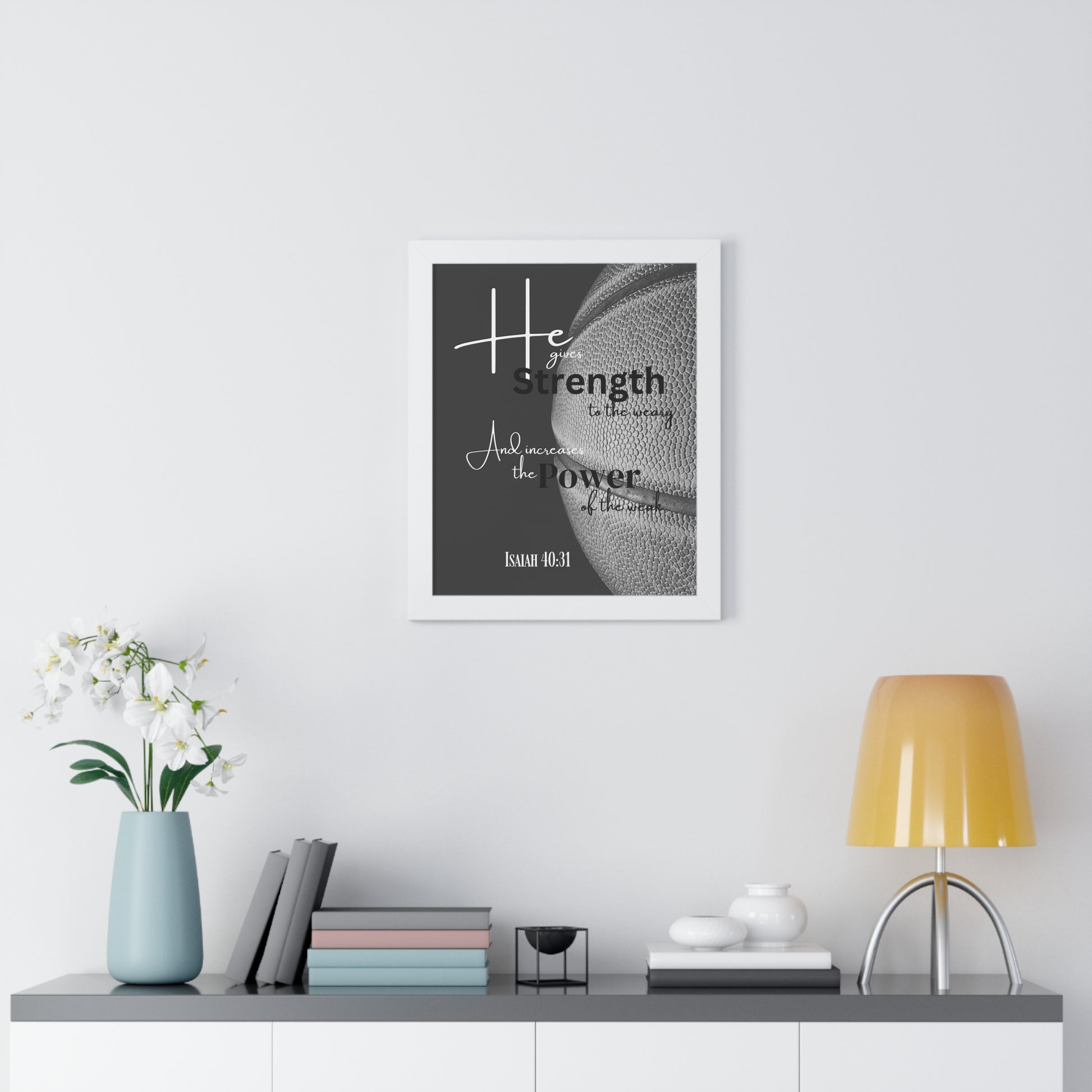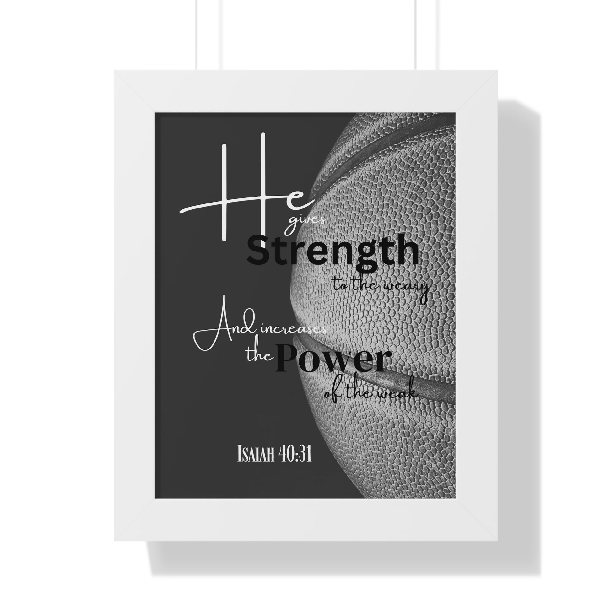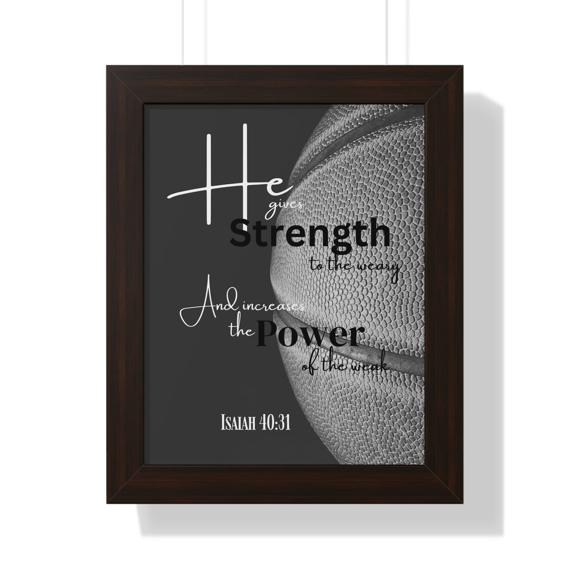 Elevate your space with this inspiring basketball poster featuring a render of the powerful Bible verse Isaiah 40:31. Let the words “He gives strength to the weary and increases the power of the weak” accompany your love of for the game. Perfect for any basketball enthusiast seeking motivation and faith in their surroundings.