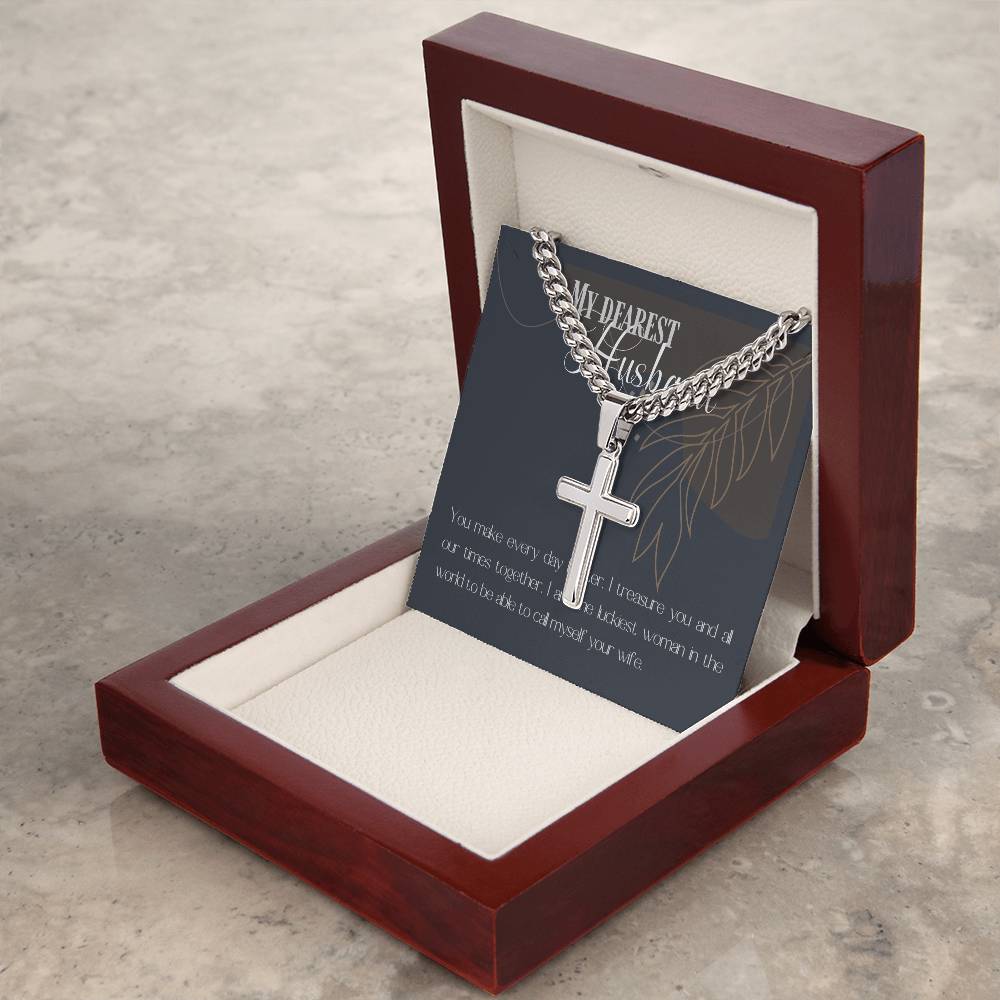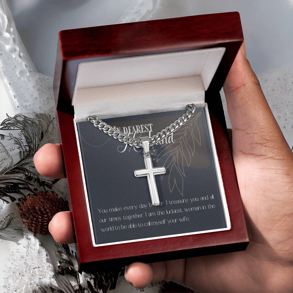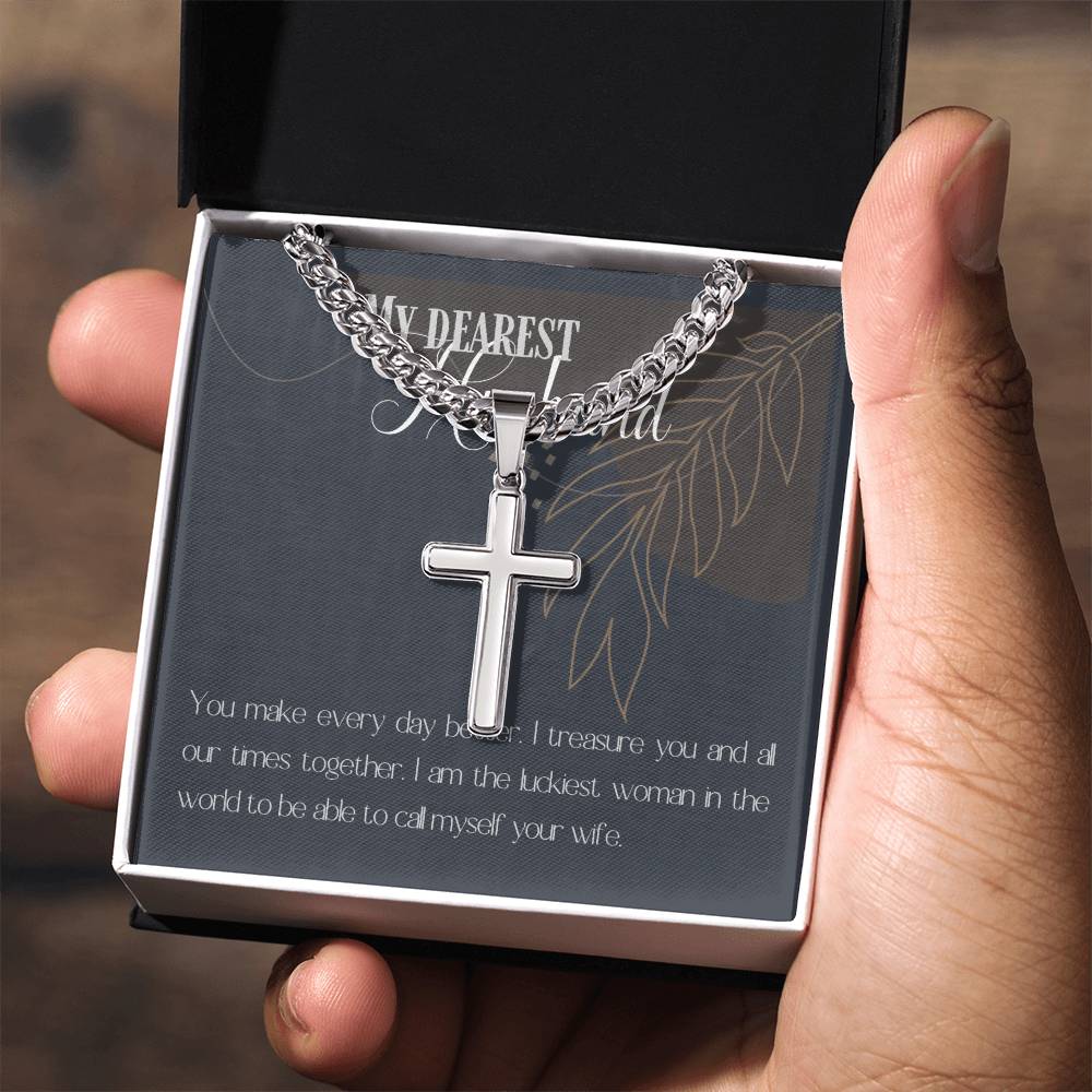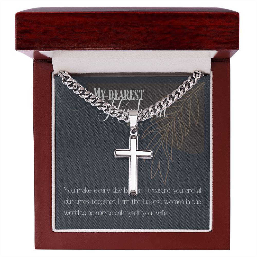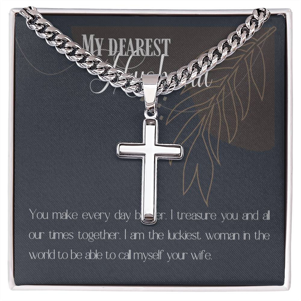 Show your appreciation and love to the special man in your life with a beautiful Artisan Cross Necklace with the message "My Dearest Husband, you make every day better. I treasure you and our times together. I am the luckiest woman in the world to be able to call myself your wife." Let this message say all the unspoken words for you.