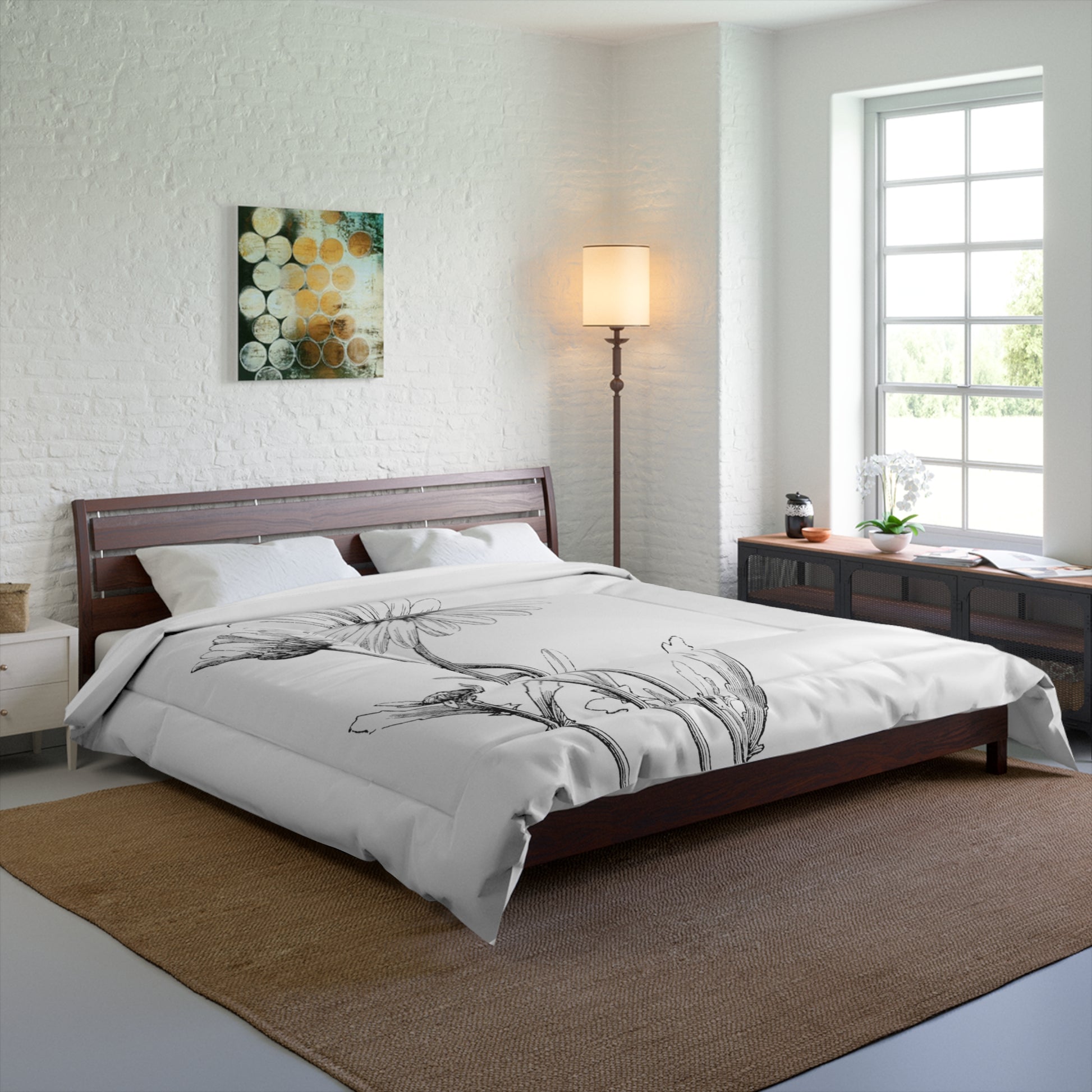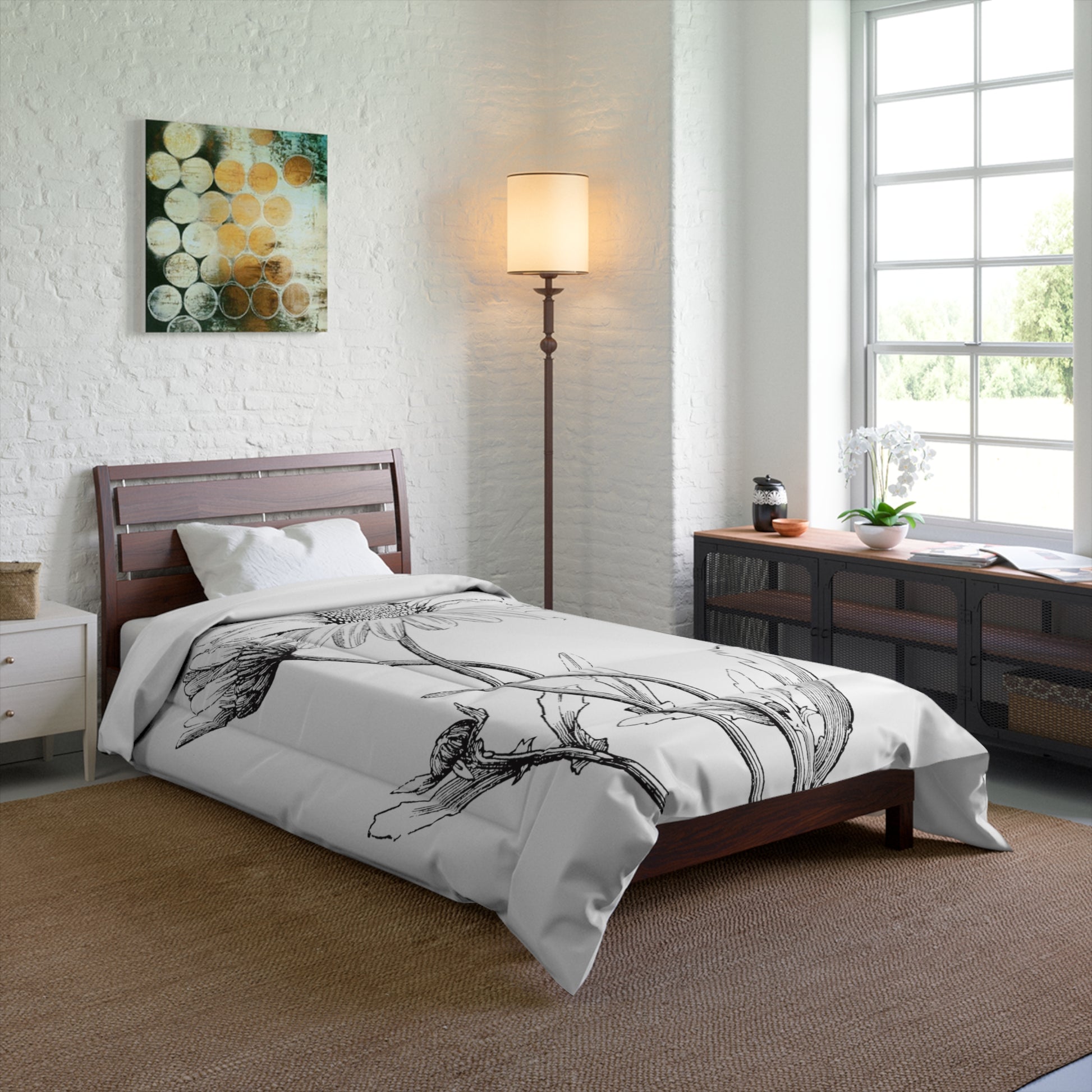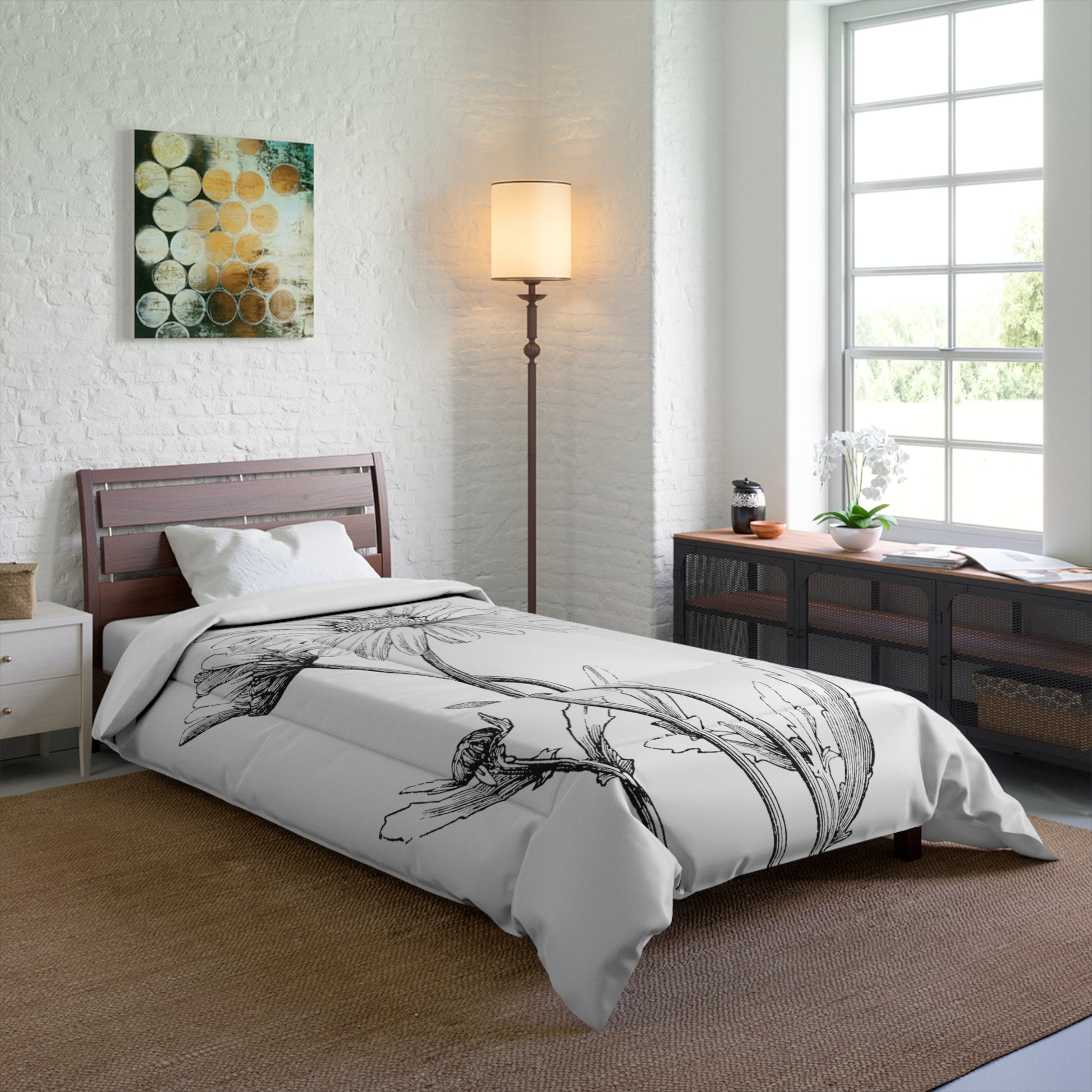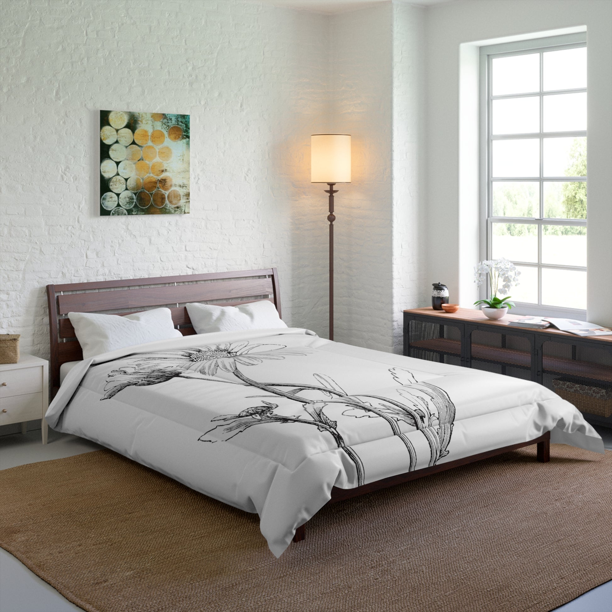 Introducing one of our spring comforters - Mono Bliss, a delightful addition to your bedroom decor. This luxurious comforter features two striking black and white daisy silhouettes, adding a touch of elegance and charm to your space. Made with premium materials, it's not just visually appealing but also ensures comfort and warmth throughout the seasons. The Mono Bliss spring comforter is available in multiple sizes, allowing you to find the perfect fit for your bed. It coordinates with our throw pillows in the spring line including "Mono Bliss Throw Pillow", "Bella Fiori Throw Pillow", and "Bellissimi Fiori Throw Pillow", allowing you the ability to fully customize to your personality. Whether you're looking to refresh your master suite or guest room, this comforter is a versatile choice. Embrace the beauty of spring all year round with our Mono Bliss spring comforter, where style meets comfort effortlessly.