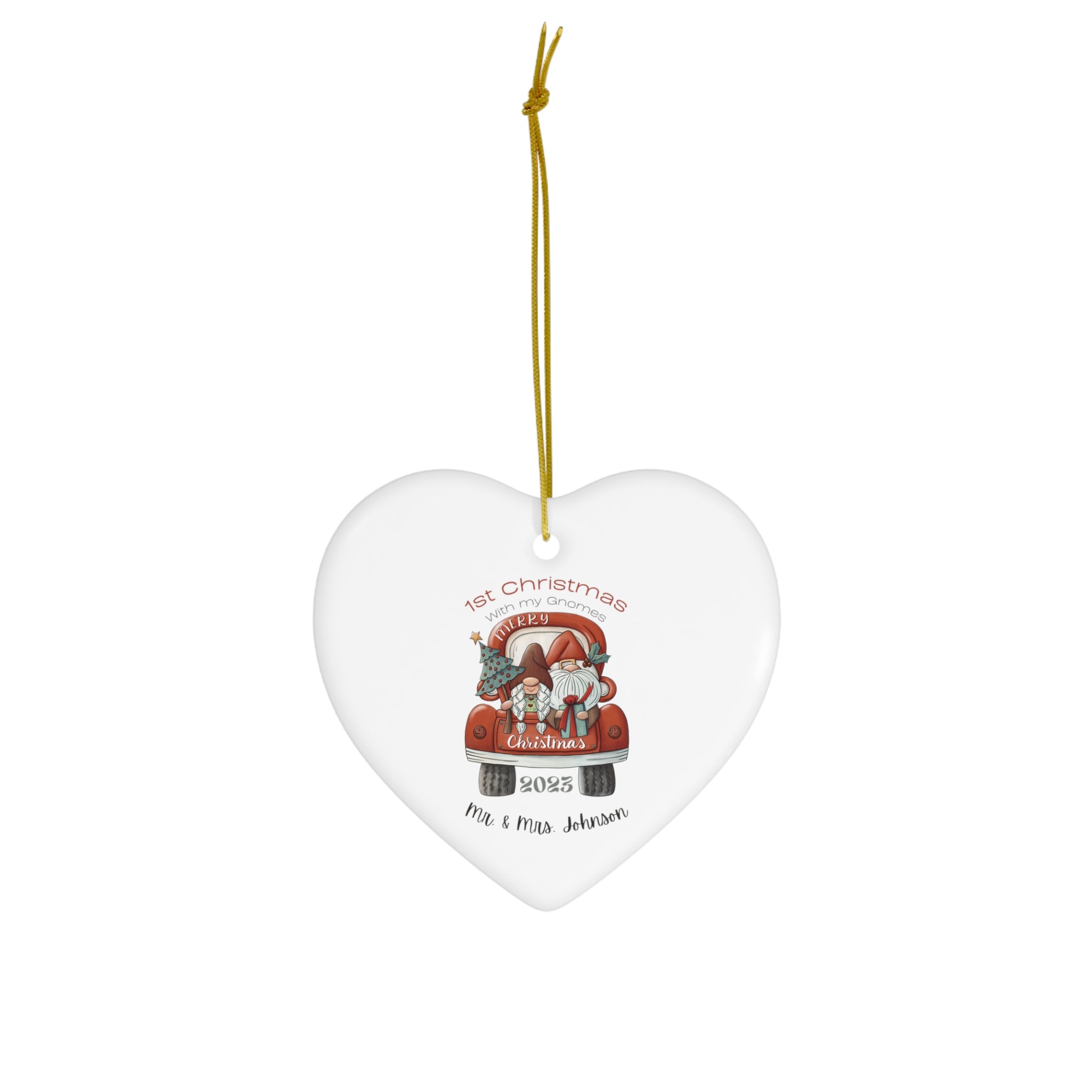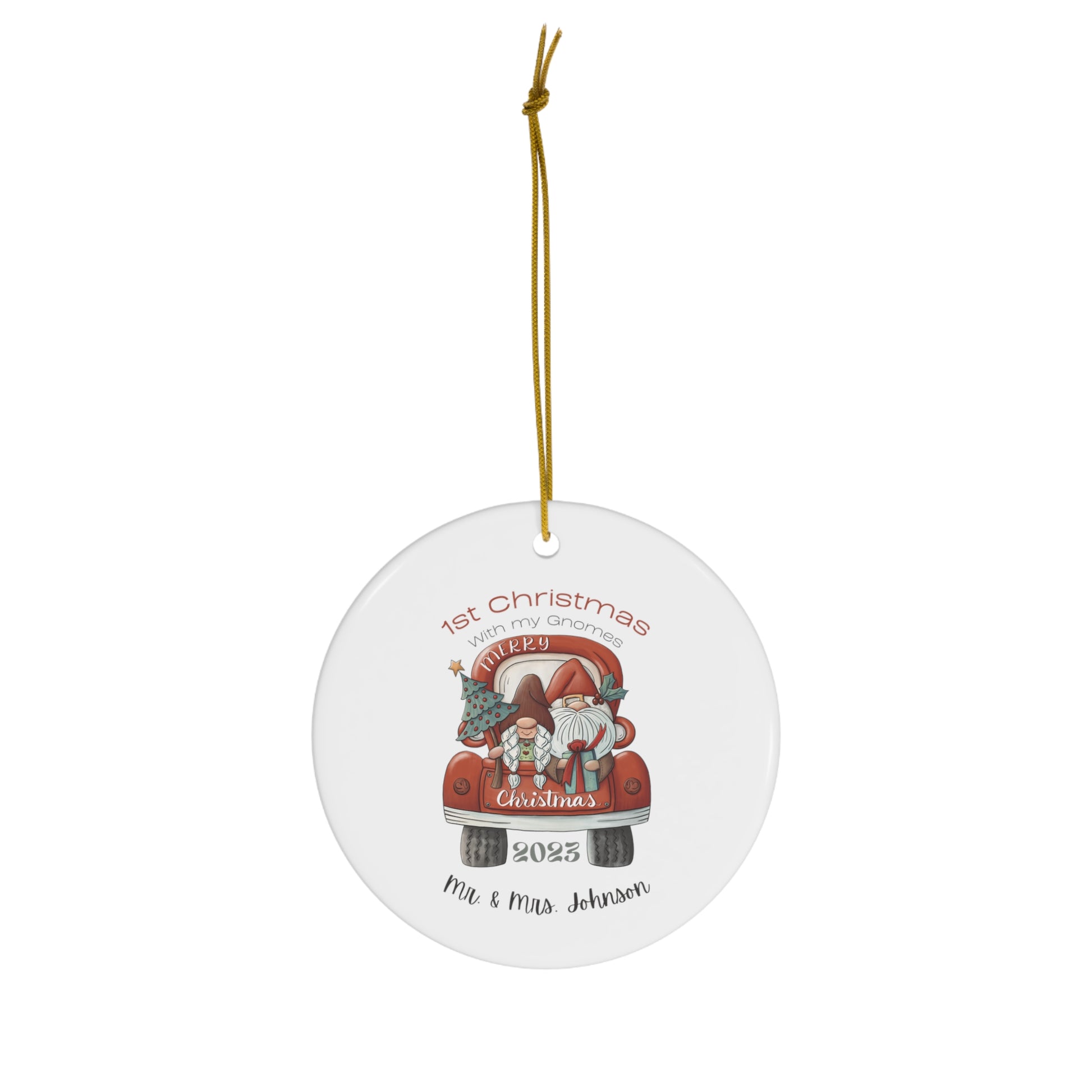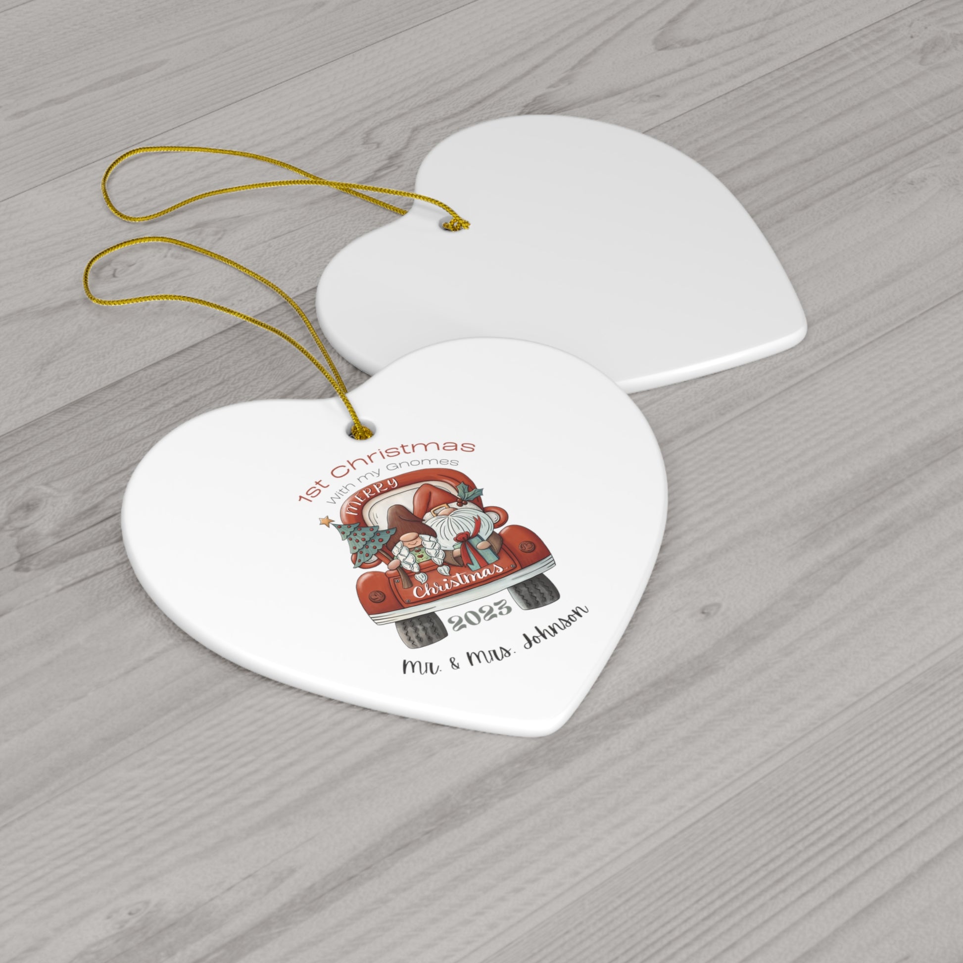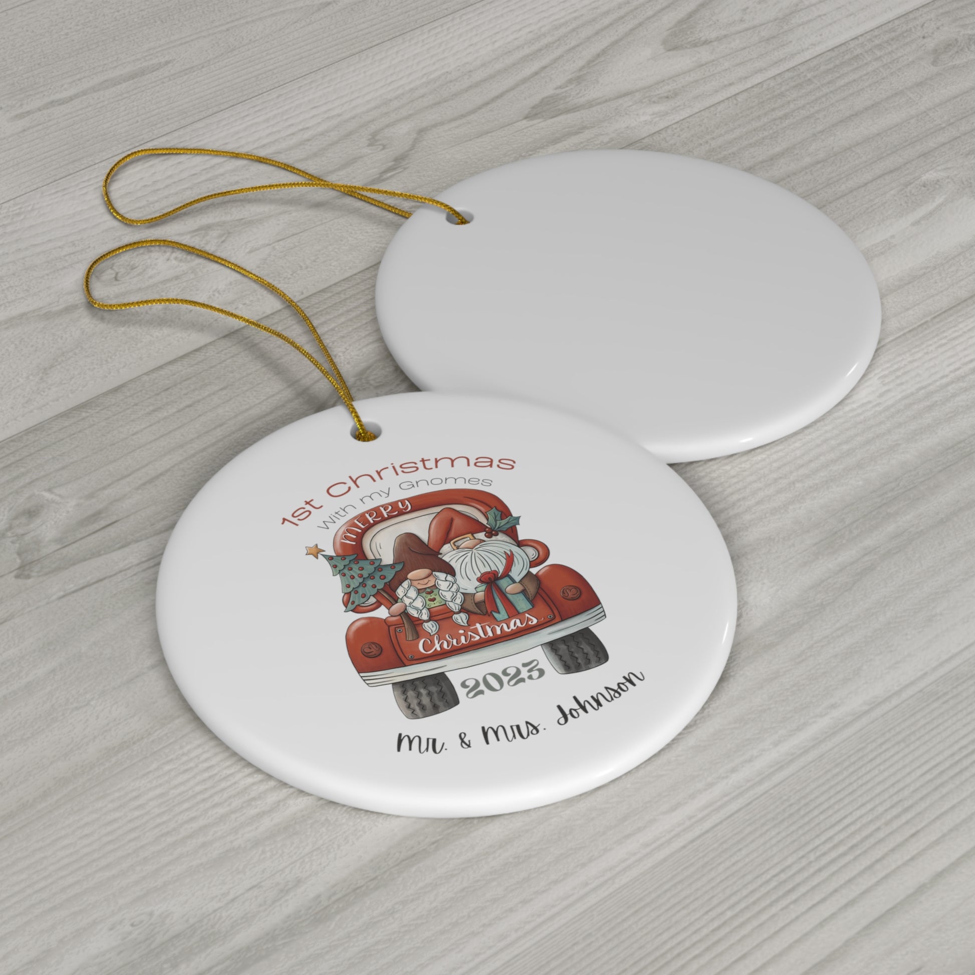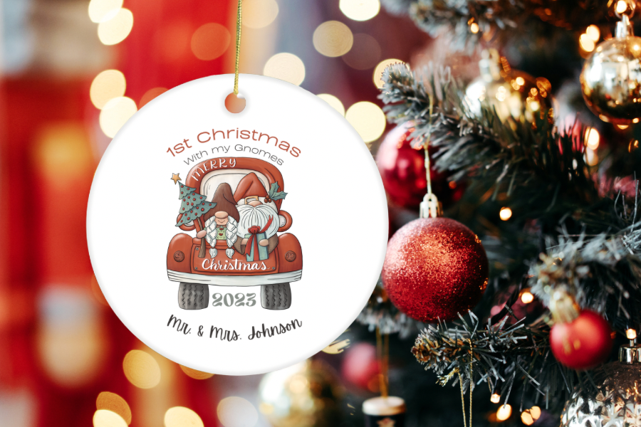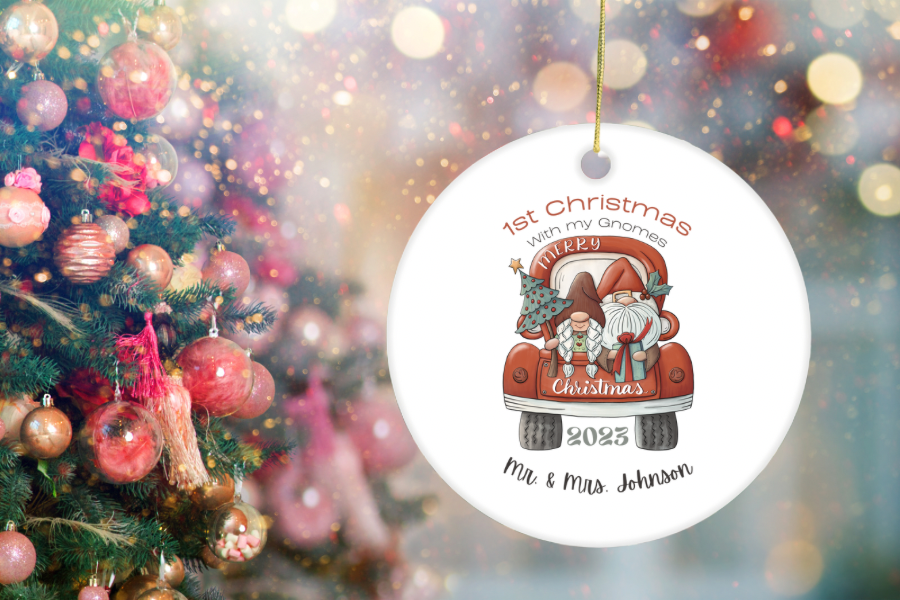 This “2023 1st Christmas Hanging with my Gnomes” Ceramic Christmas ornament is a cute gnome design perfect for that wedding gift, Christmas gift, or start to a growing collection. Beautifully crafted keepsake, designed to commemorate the special milestone of a couple’s first Christmas as husband and wife. This ornament symbolizes the beginning of a lifelong journey and serves as a cherished reminder of the joy and love shared during this significant time year after year. Its festive design and sentimental value make it a perfect addition to any holiday decor, creating warm and cherished memories for years to come.