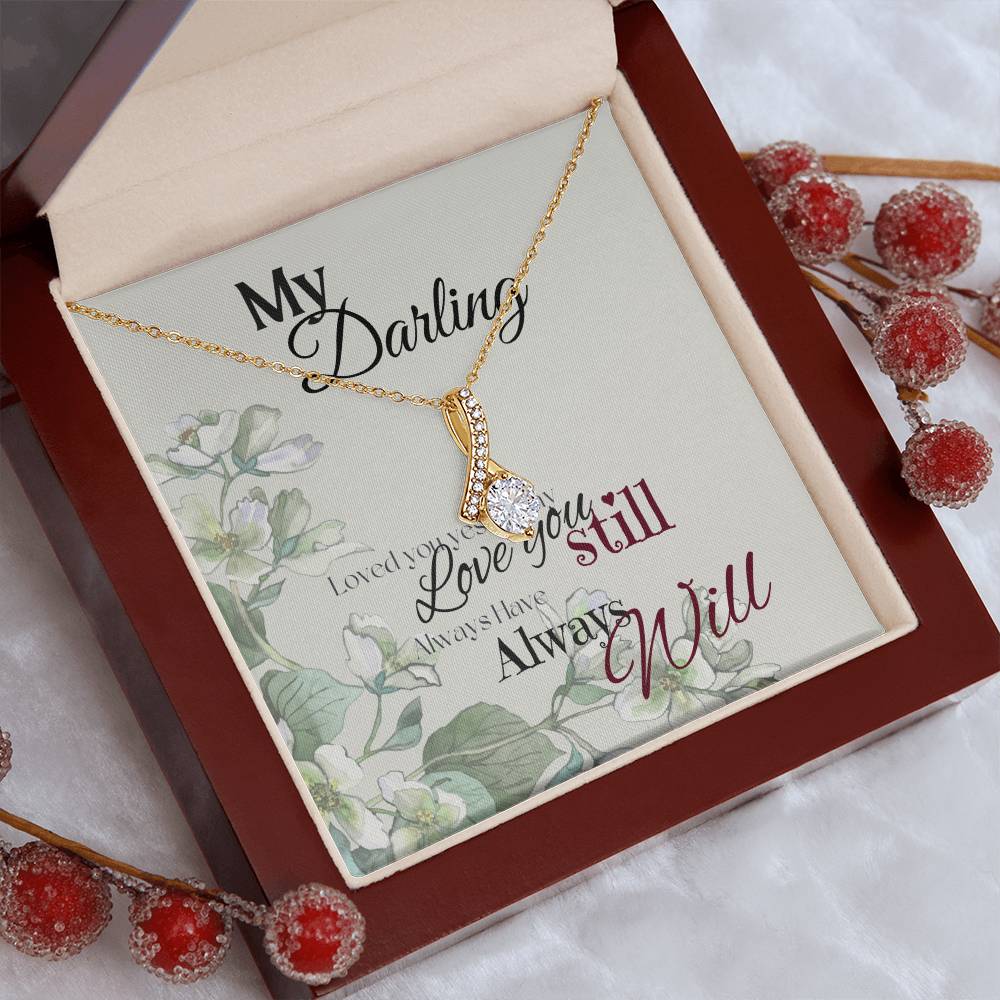 Tell your special someone how much they mean to you with this elegant Alluring Beauty Necklace accompanied with the well-known message "My Darling, Loved you yesterday, Love you still, Always have, Always Will." Find the perfect personalized jewelry at our store. From custom message necklaces to bracelets, our collection offers unique pieces for every style. Whether for yourself or a thoughtful gift, explore our range of personalized jewelry today and make a statement with pieces that reflect your personality."