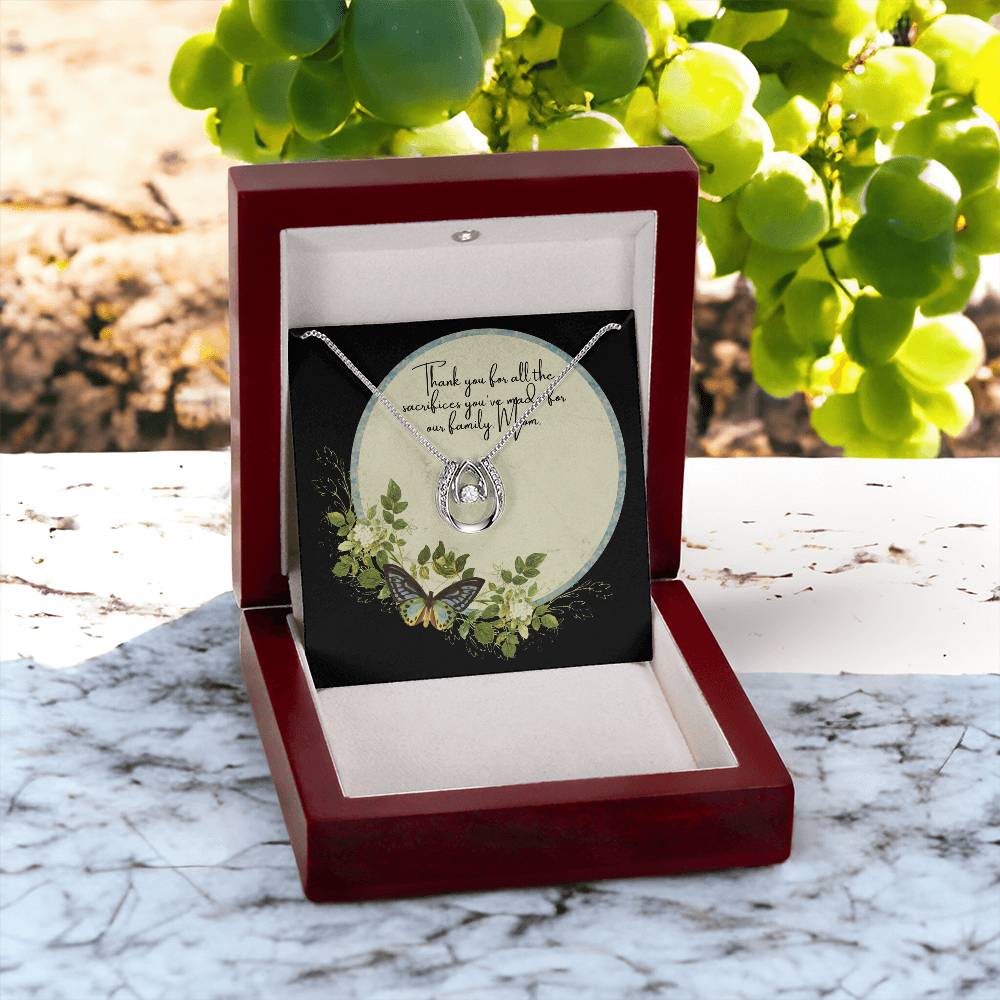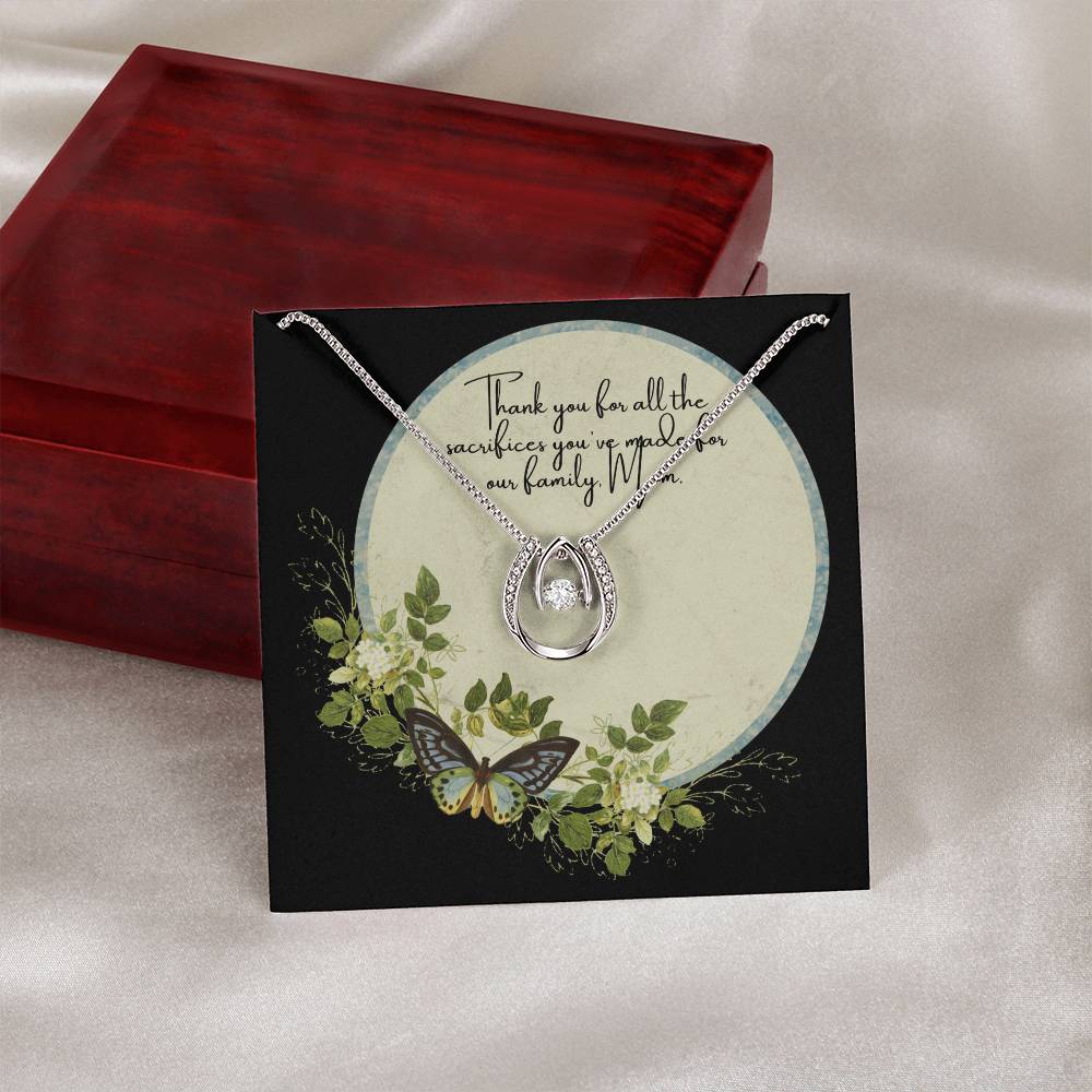 Celebrate your mom's unwavering dedication with our Silver Horseshoe Necklace. Paired with a heartfelt message card expressing gratitude for her sacrifices, it's a poignant reminder of her love. Crafted with love, the horseshoe symbolizes luck and protection, reflecting the support she provides. Show your appreciation for her selflessness with this meaningful gift, a token of love that she'll treasure for years to come.