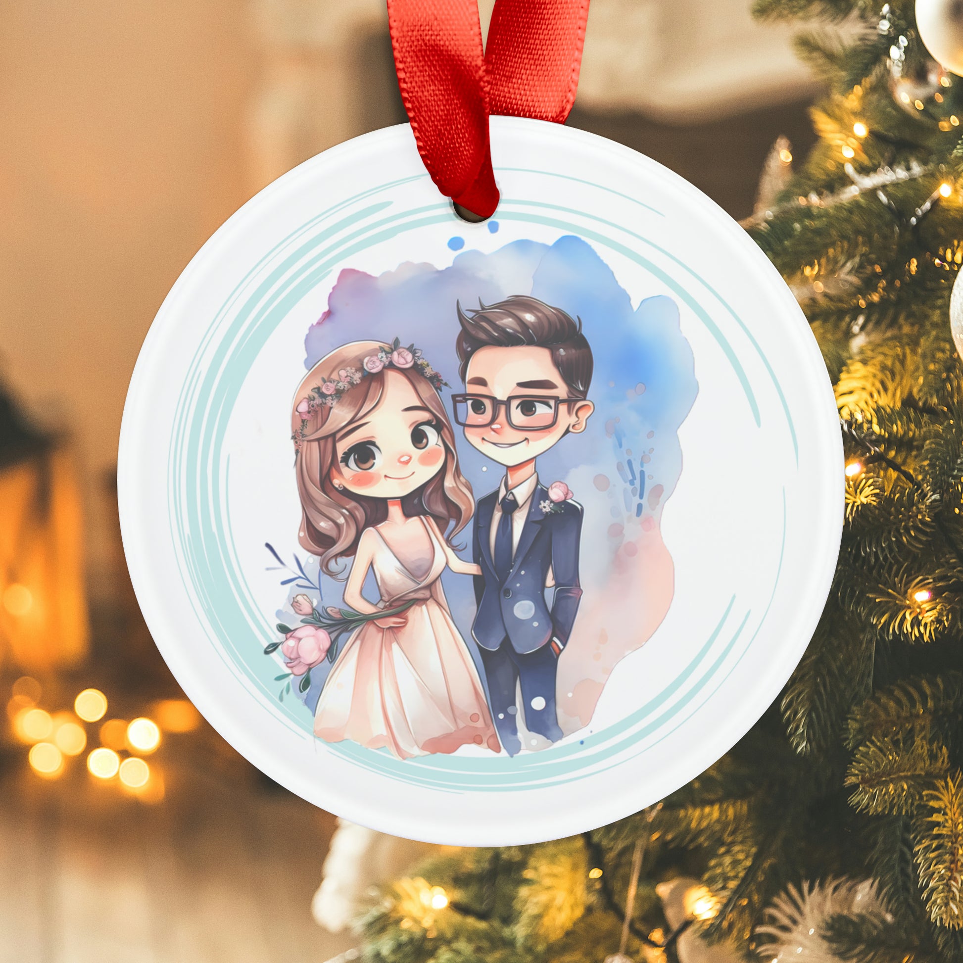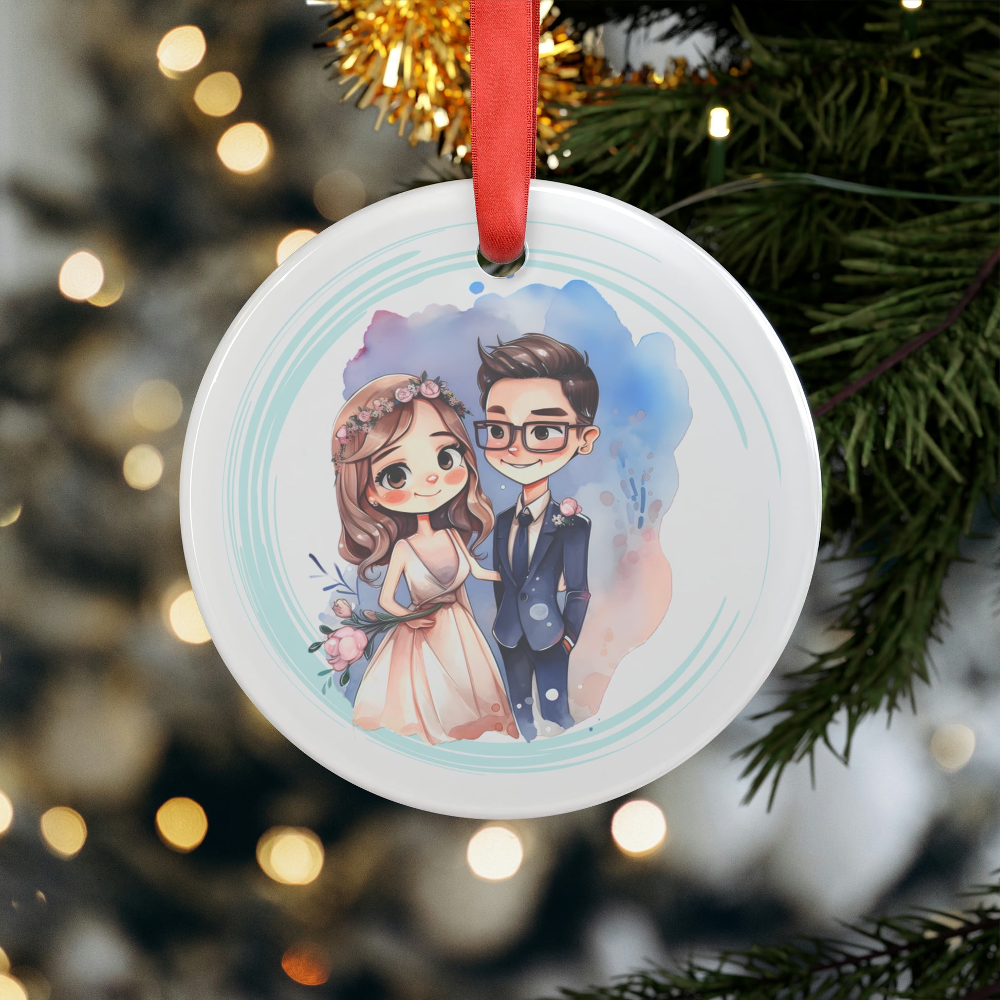 This watercolor design is inspired by the giddy feeling every couple gets on that special day. Not the traditional classic wedding ornament gift, this Mr. & Mrs. 1st Christmas Ornament features a soft colorful picture of a newlywed couple surrounded by a frame of flora on the front. The double sided print adds a personalized touch on the back with the couple's last name and wedding date seconded by the sweet saying "Two hearts in love never need words."