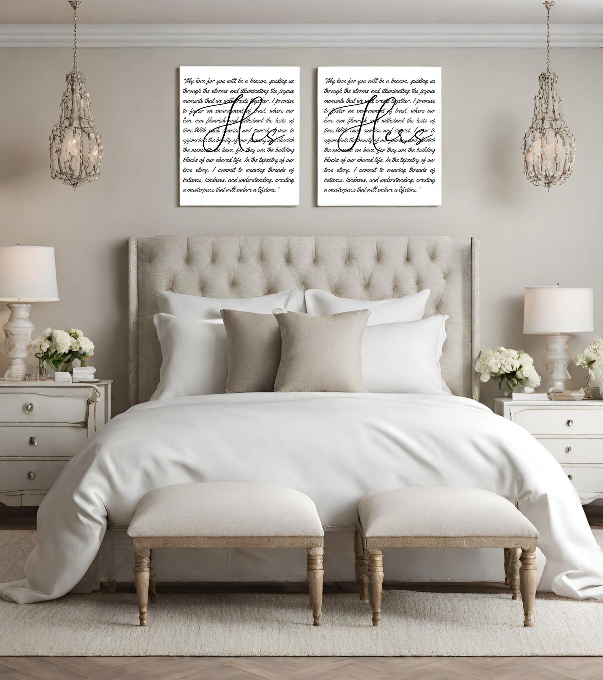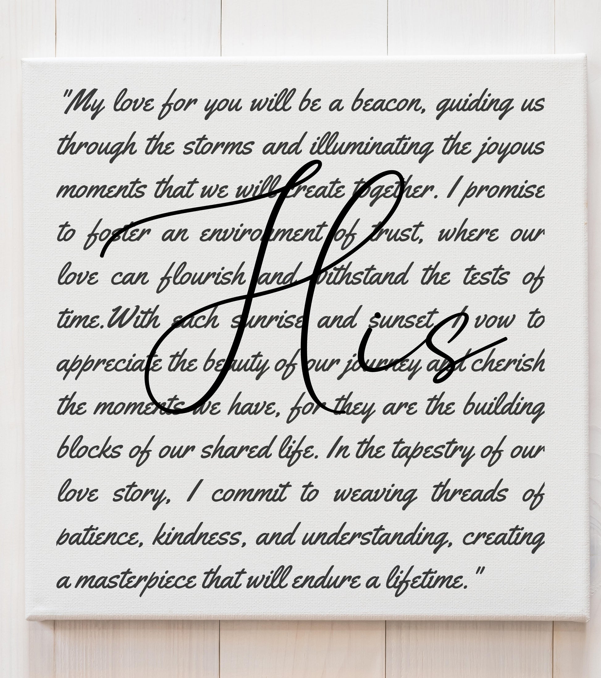 This Set of 2 Square Canvas Gallery Vow wall art prints is simplicity in elegance. Showcasing "His" & "Her" vows on separate matching canvases to be placed side-by-side just like the partnership of the individual's who made the promises displayed.